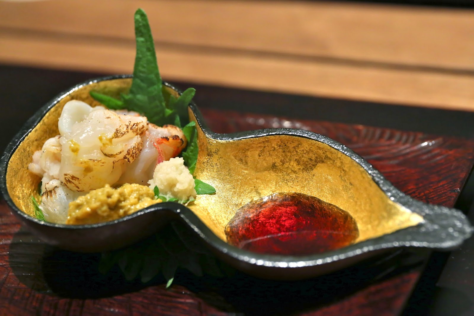 Seared Ise lobster with 'ponzu' sauce (伊勢海老の焼霜) - the second part arrives in a hollowed half of gourd, bearing Japanese lobster (伊勢海老) together with its tomalley. The lobster’s been lightly torched and comes with a beautifully delicate smokiness. The tomalley? I’d spoon whole jars of it if given the chance.