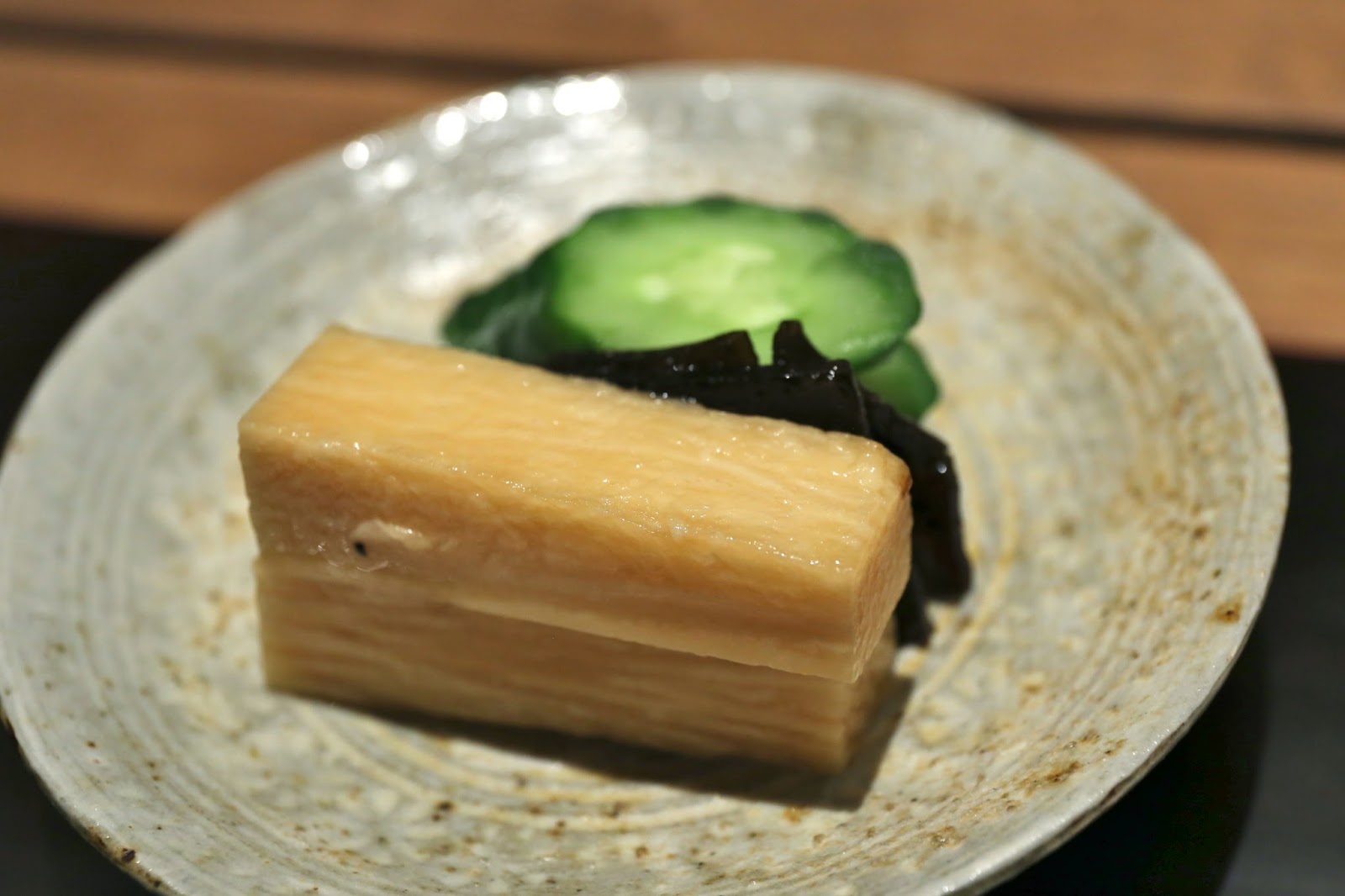 When the pickles come, you know that rice is about to be served. Tonight we’ve got marinated mountain yam (山芋), cucumber, and seaweed (若布).