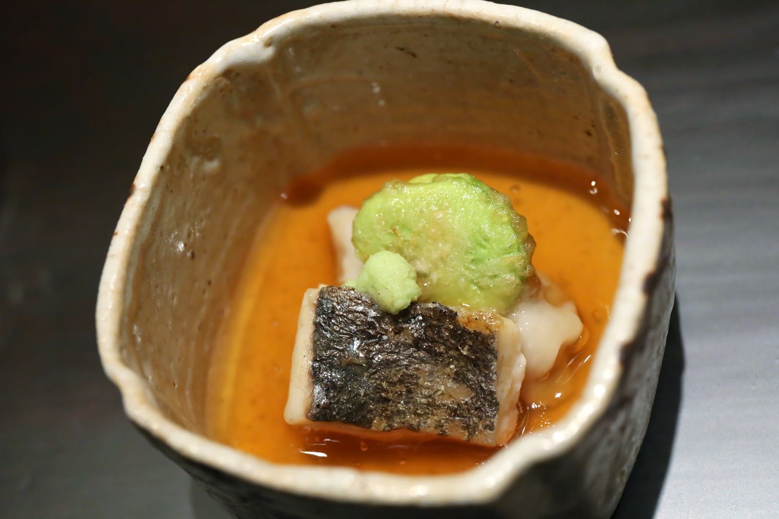 Delicacy: Spanish mackerel, broad beans and mashed taro (中皿:鰆 蚕豆 里芋) - the small piece of grilled Spanish mackerel (鰆) came with a broad bean (蚕豆) that was almost as big and some taro mash. Three bites. Delicate indeed.