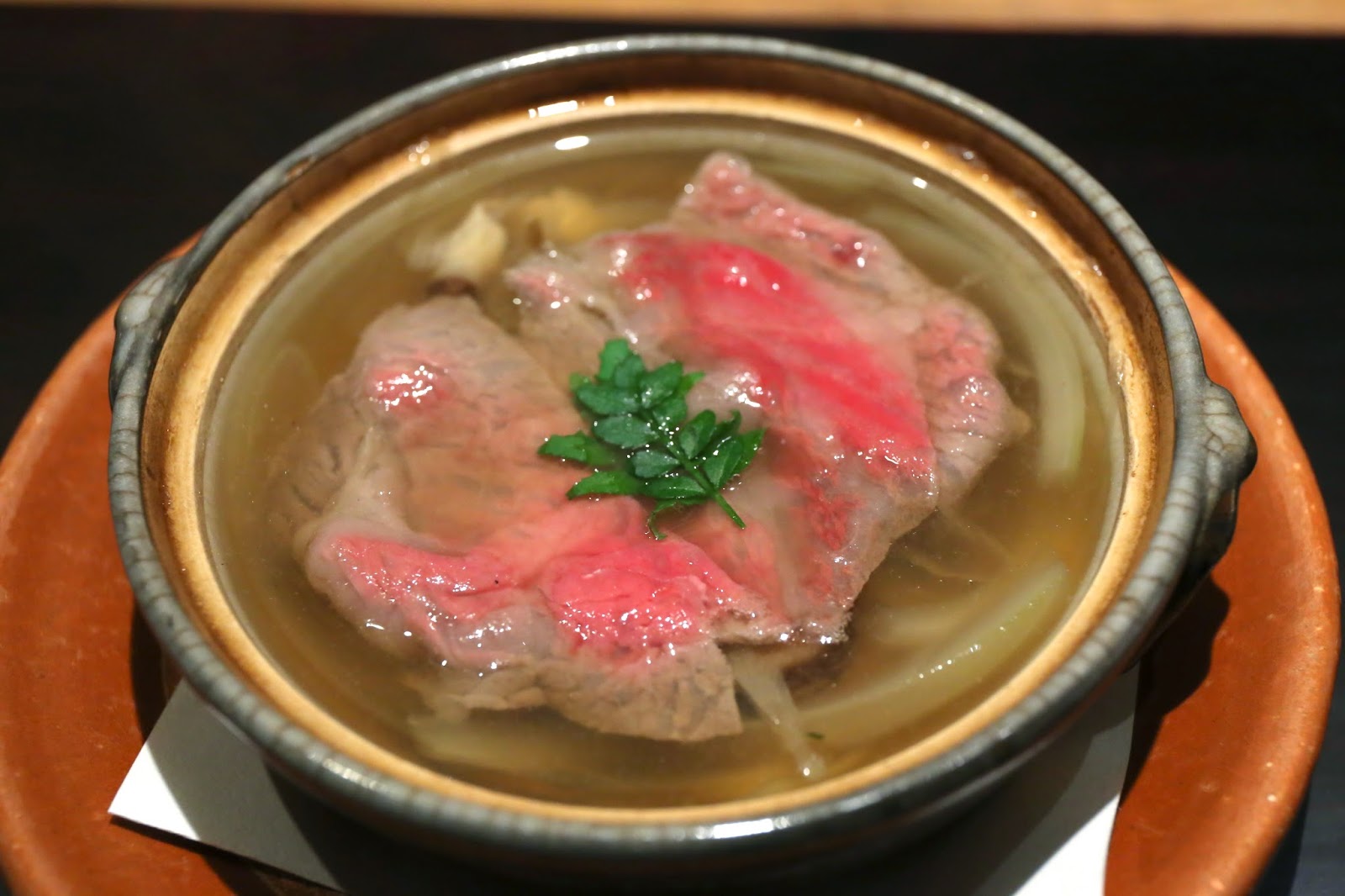 Hot pot: thinly sliced Japanese beef with seasonal vegetables (煮物:牛鍋 椎茸 筍) - gyu-nabe (牛鍋) is very traditional and hearty, but this is the dainty version. The little clay pot came with a very hot soup, and thin slices of raw beef from Kumamoto Prefecture (熊本県) was simply placed on top so that it gets cooked by the residual heat. Garnished with sansho leaves (木の芽).