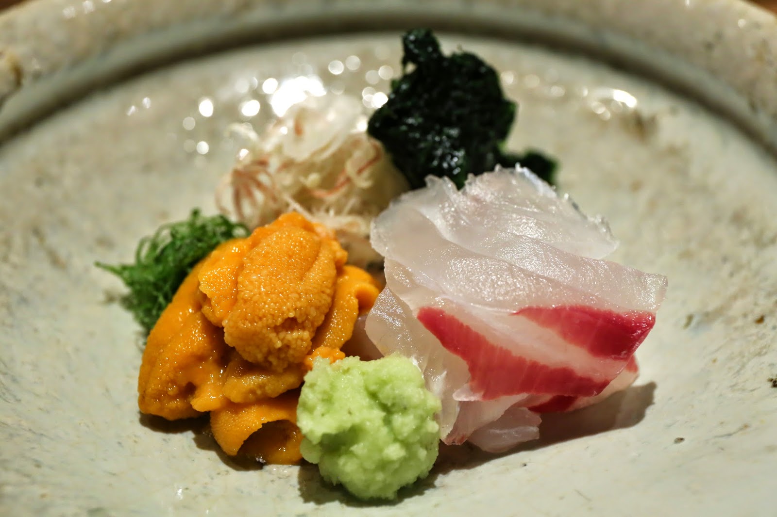 Sashimi: sea bream and sea urchin garnished with fresh seaweed and Japanese herbs (造り:鯛 雲丹) - the first part of our sashimi course arrives, and I take in the simple and clean flavors of the sea bream (鯛) from Kyushu (九州玄海) first, with a wonderfully chewy texture that can only come from the freshest catch. Then the rich and smooth sea urchin, like a sweet milkshake with a touch of the ocean. The beautiful pile of seaweed (若布) in the back was delicious, as was the mountain of finely-diced leeks next to it.