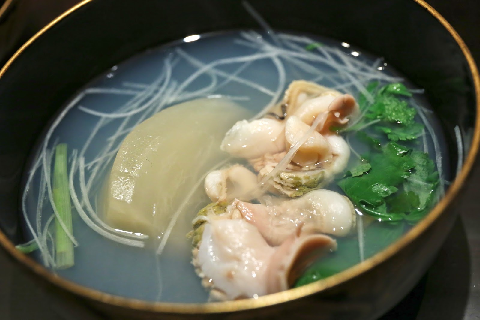 Soup: hard clam and 'Shogoin' turnip from Kyoto (椀物:地蛤 かぶら) - I looooove the soup course in kaiseki meals, because they often come with a clean and simple broth which warms the stomach and instantly relaxes the body – pure comfort food. Tonight we’ve got a simple hard clam (地蛤) from Chiba Prefecture (千葉県) whose meat was sweet and pure. A piece of turnip (蕪菁) from Shogoin (聖護院) in Kyoto, together with a few sprigs of coriander and fine shreds of leek. I could drink 5 bowls of this and not get tired of it.