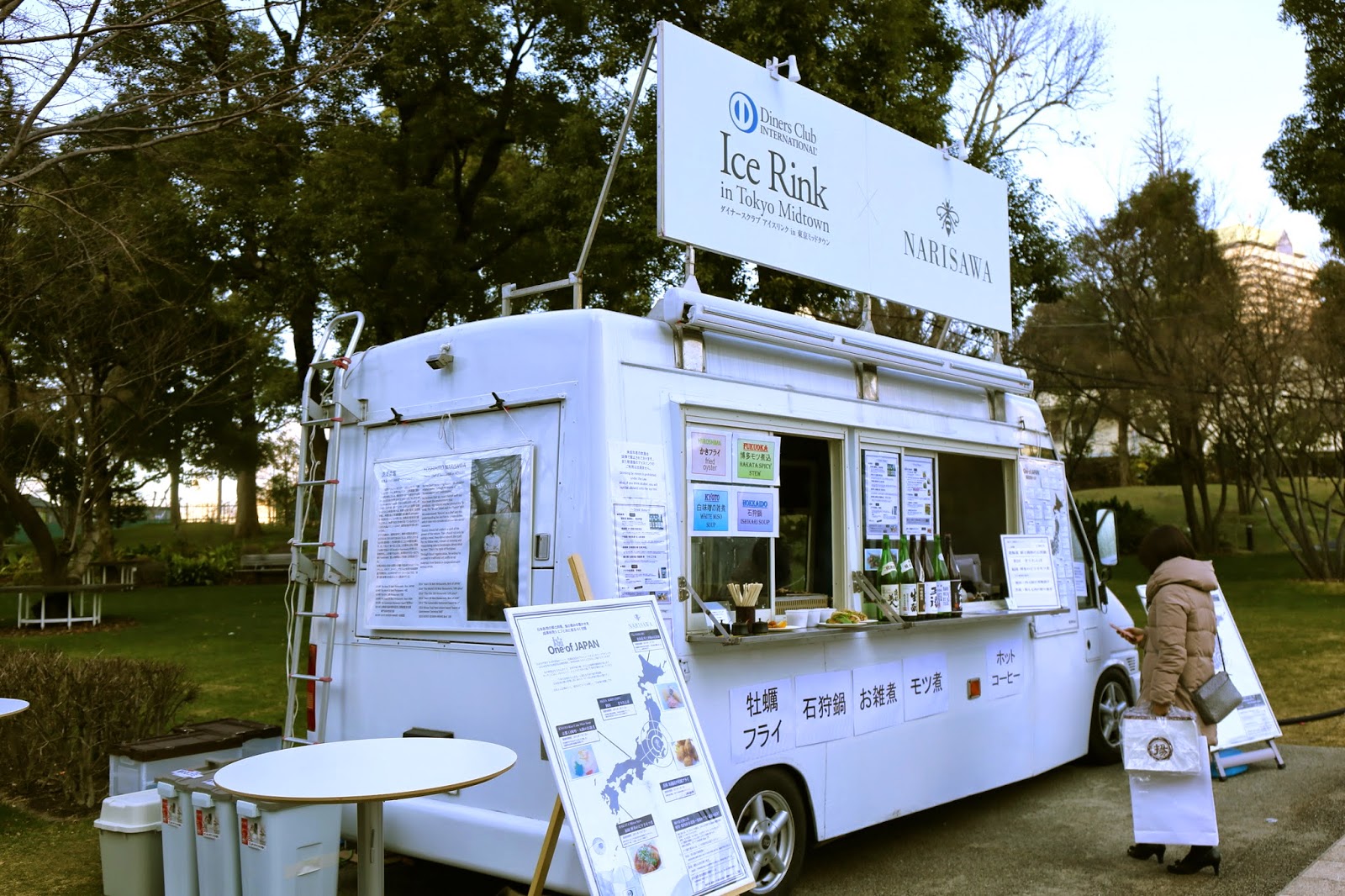 So on day 2 of my trip, as the sun was out and the sky was blue, I suggested to Cow and Chicken that we hit the truck. They very kindly obliged and drove me over to Tokyo Midtown. The food truck was parked next to the Diners Club Ice Rink, and looked like it was also sponsored by Diners Club. I was giddy with anticipation as I approached it...