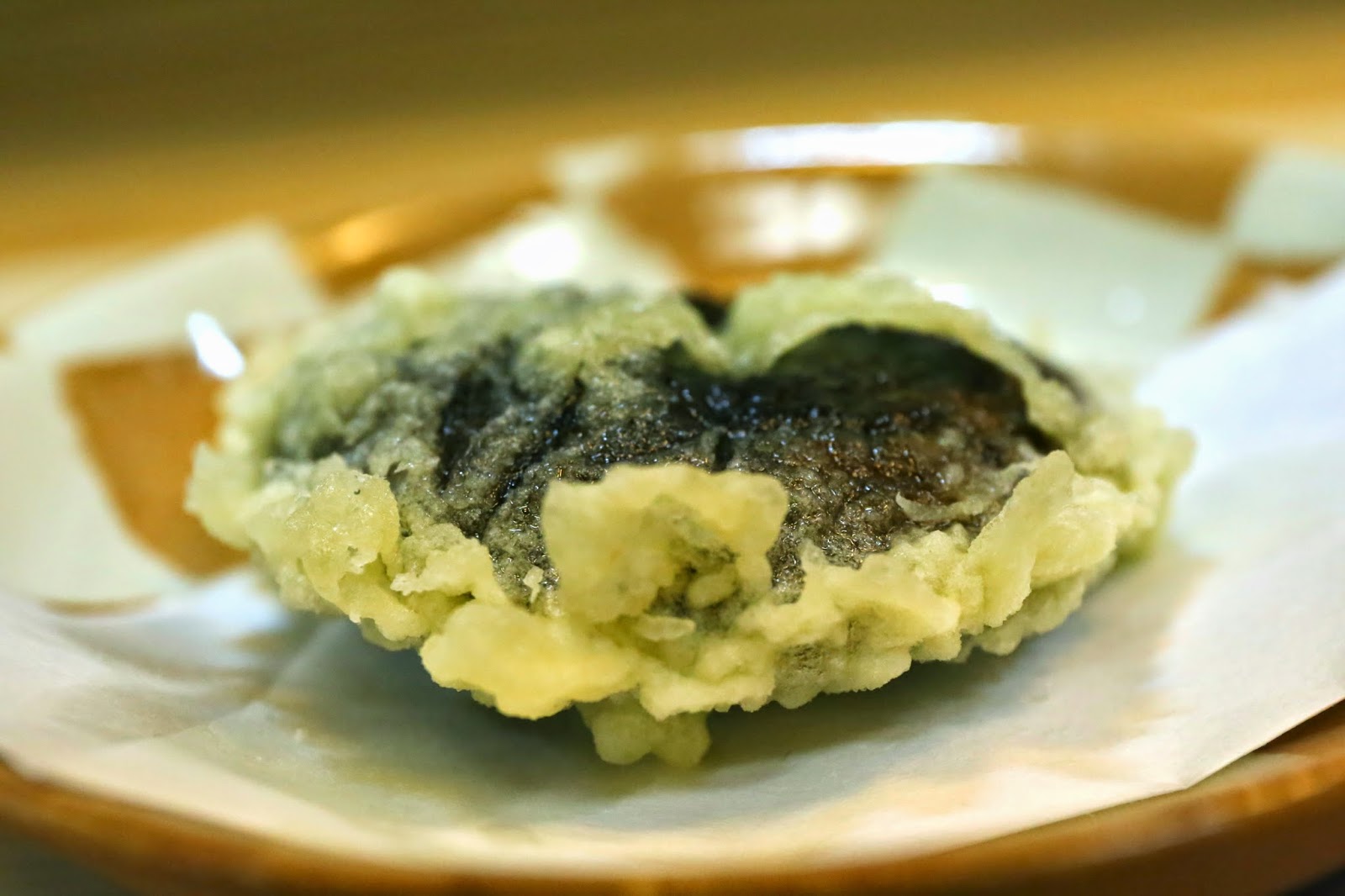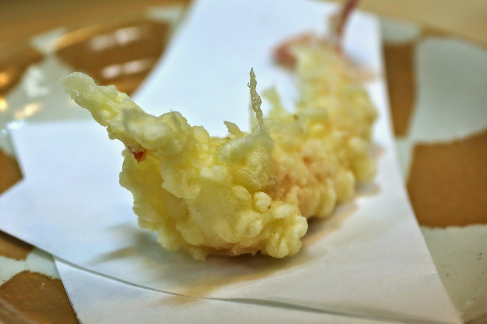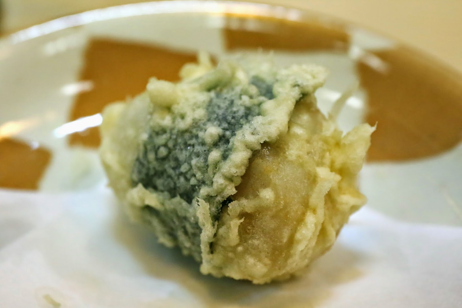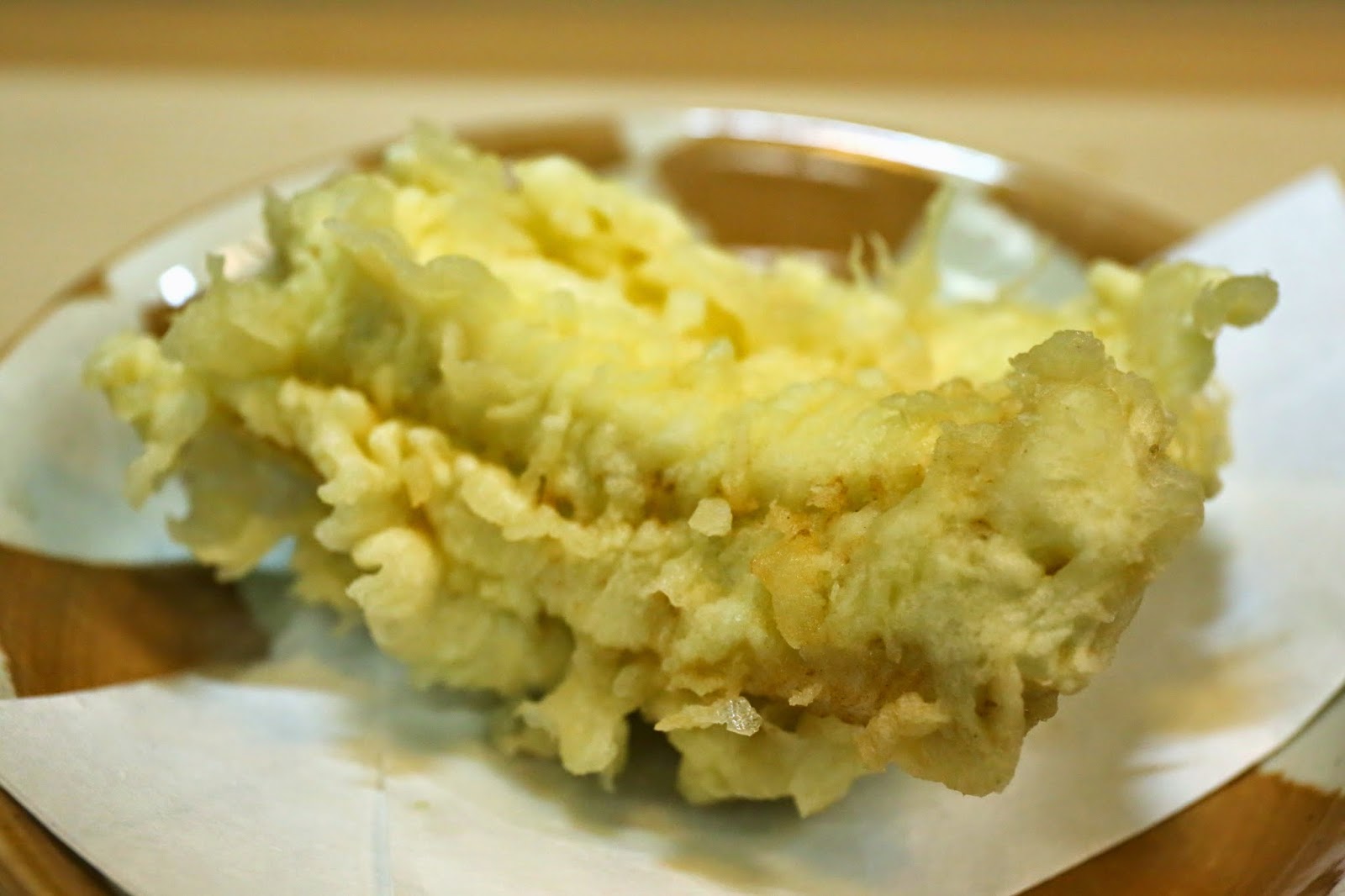 The boss tells us that he uses sunflower oil instead of the sesame oil more common in Edomae (江戸前) style of tempura. Of course everything is done at low heat.