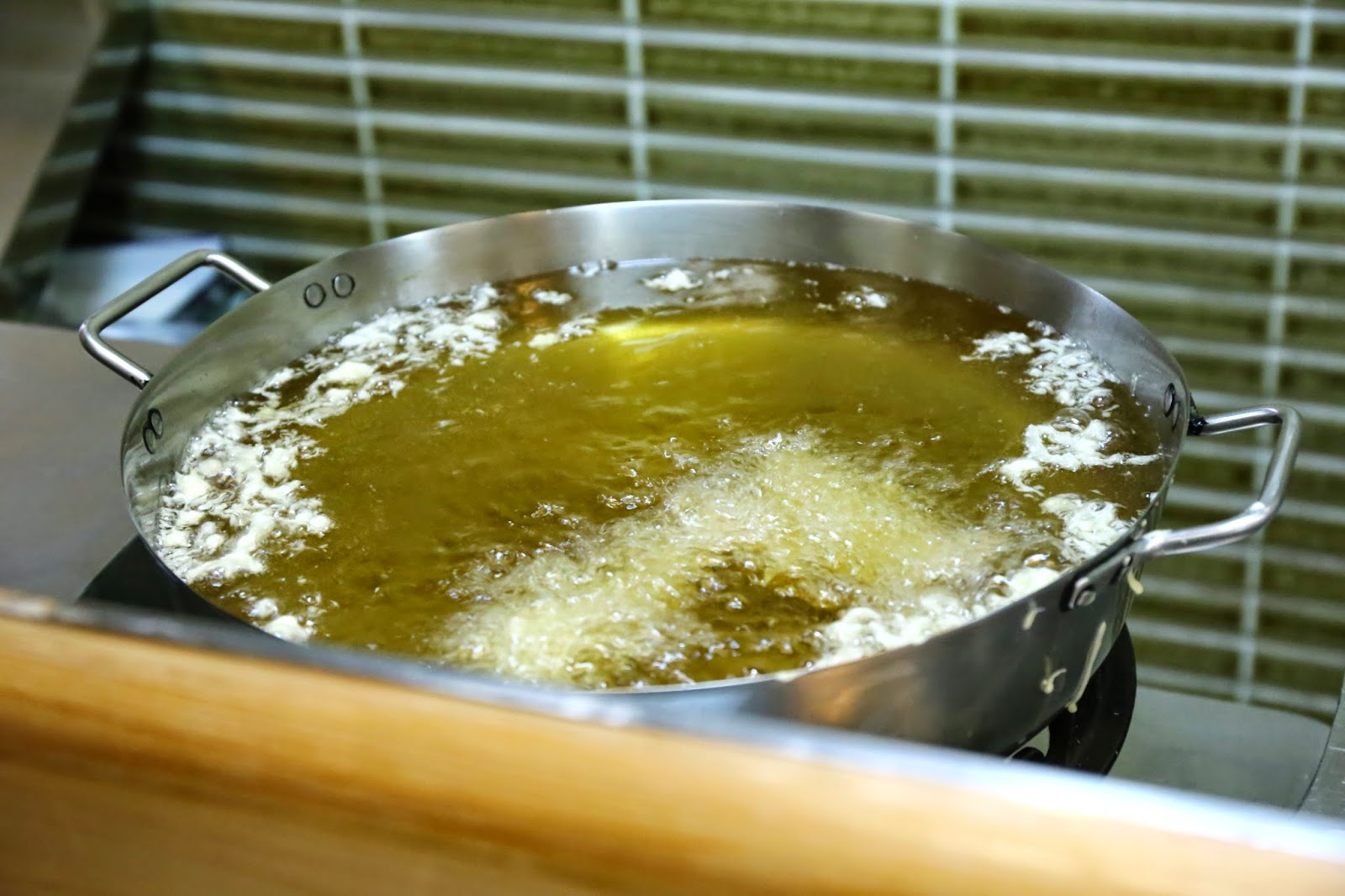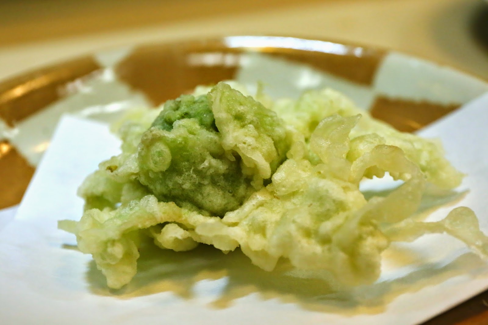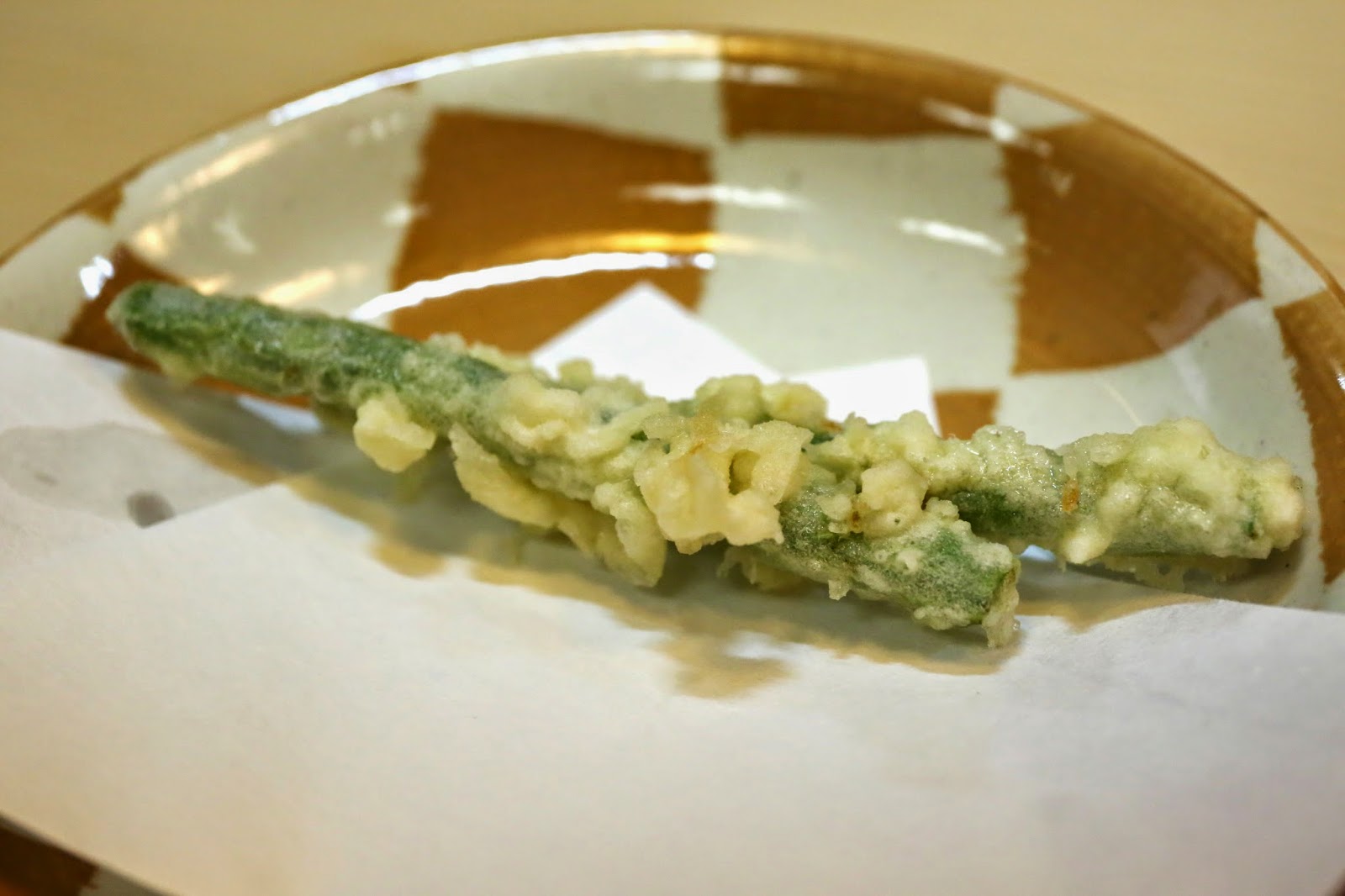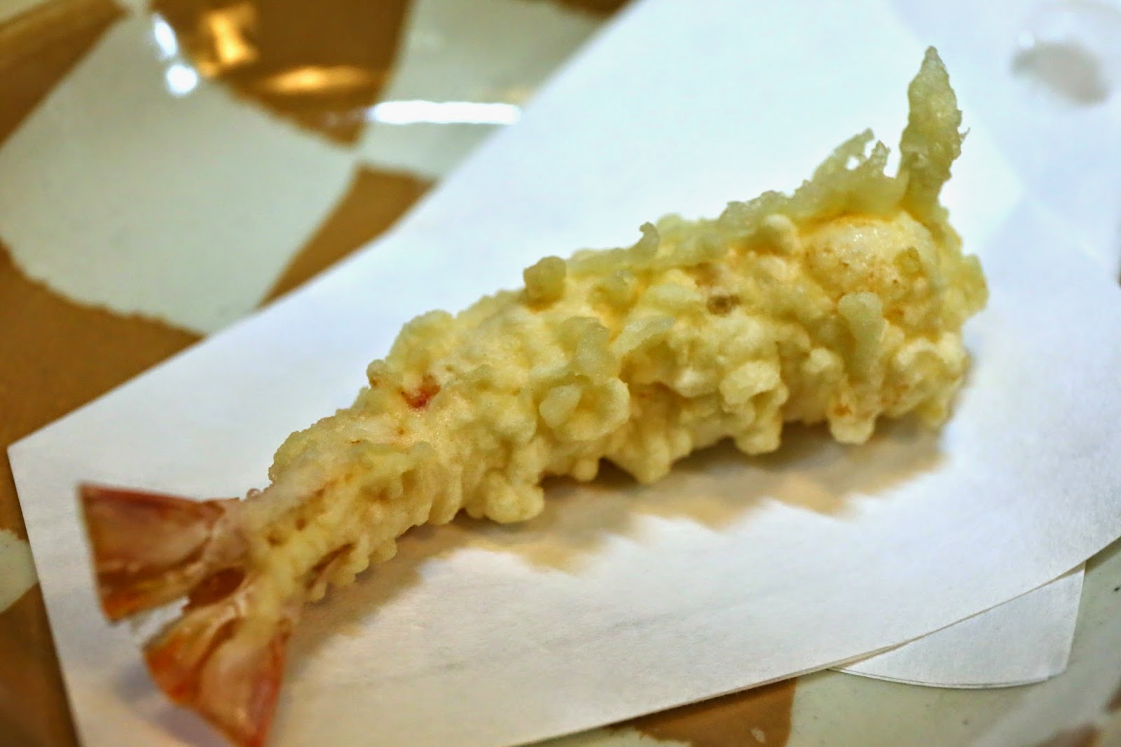 The boss tells us that he uses sunflower oil instead of the sesame oil more common in Edomae (江戸前) style of tempura. Of course everything is done at low heat.