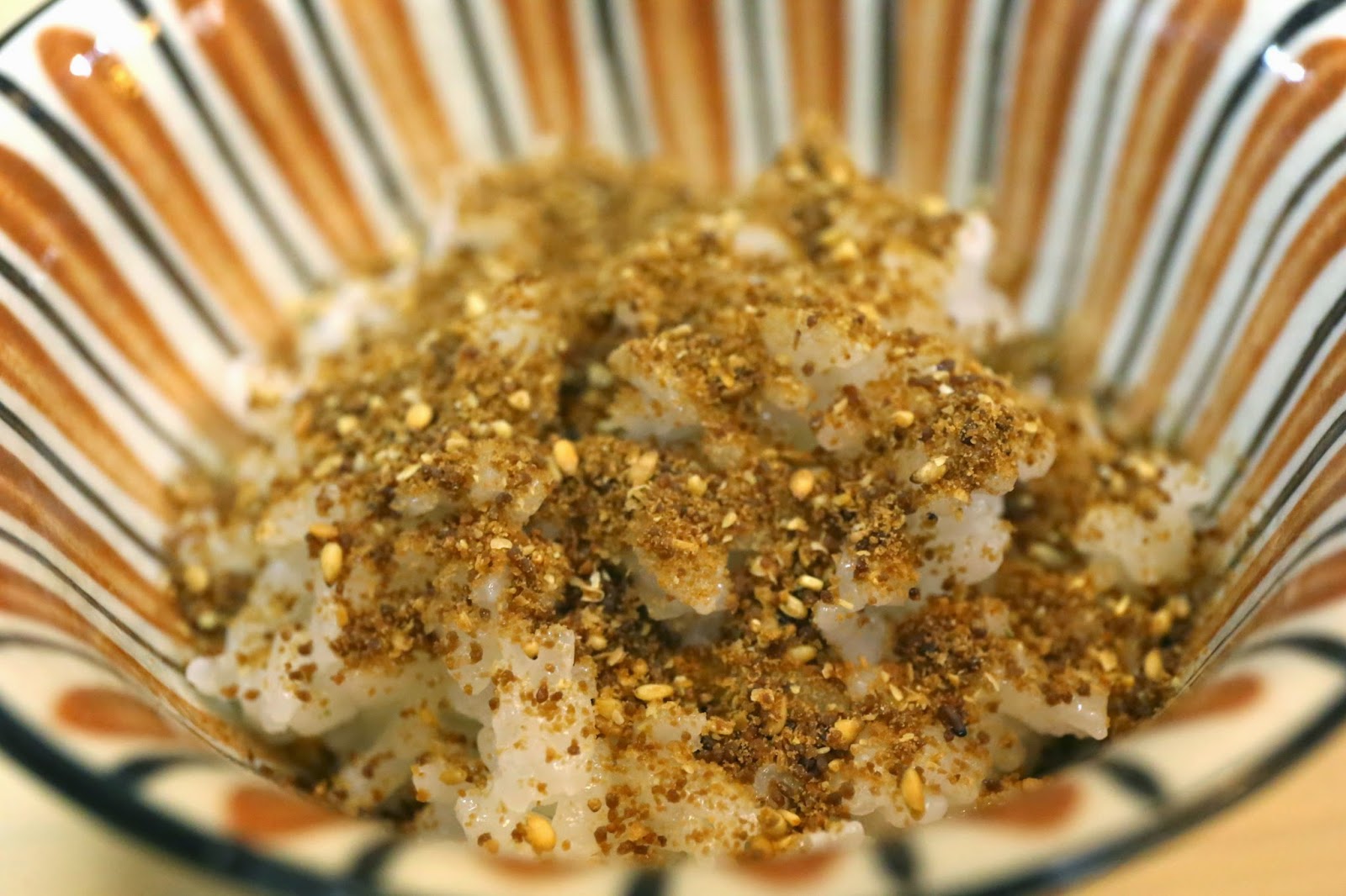 It was time to get some rice in our bellies, and I asked for a small serving. I was eagerly waiting for this, because of the flakes (ふりかけ) that would be sprinkled on top. These were first invented by the boss' father, who loved mapo tofu (麻婆豆腐) so much that it inspired him to create this.