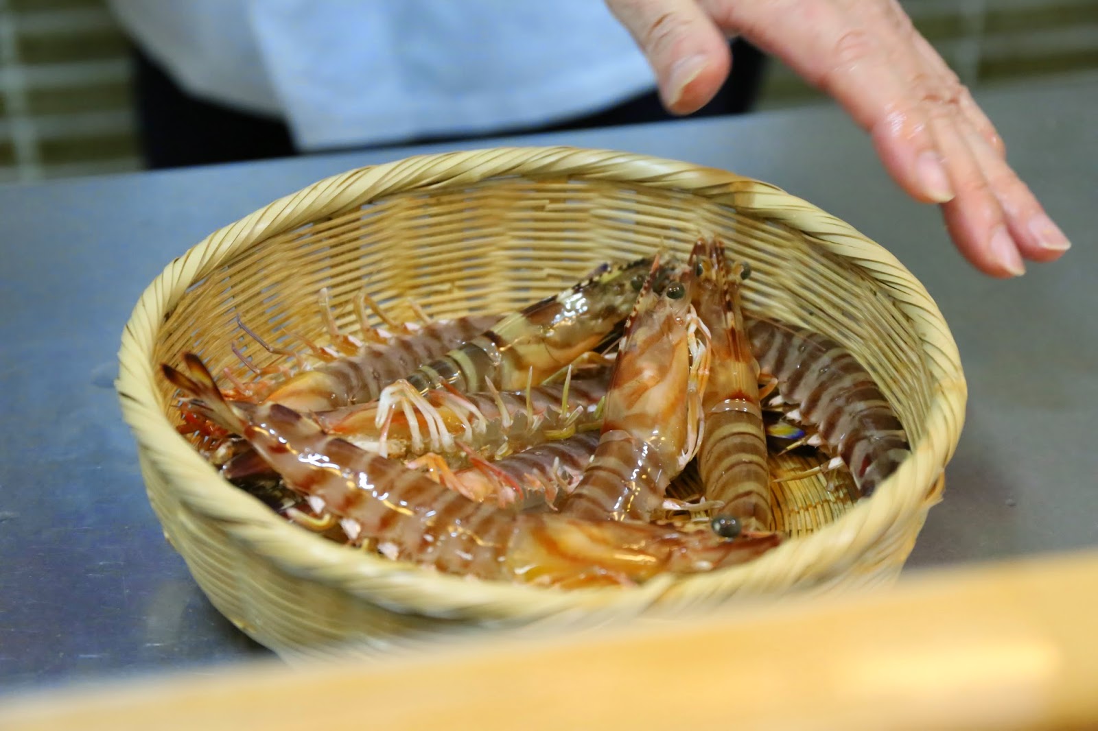The boss then starts on the Japanese tiger prawns (車海老) from Amakusa (天草) in Kyushu (九州). They were still alive and moving, before being stripped of their shells. We would each get three prawns during the meal.