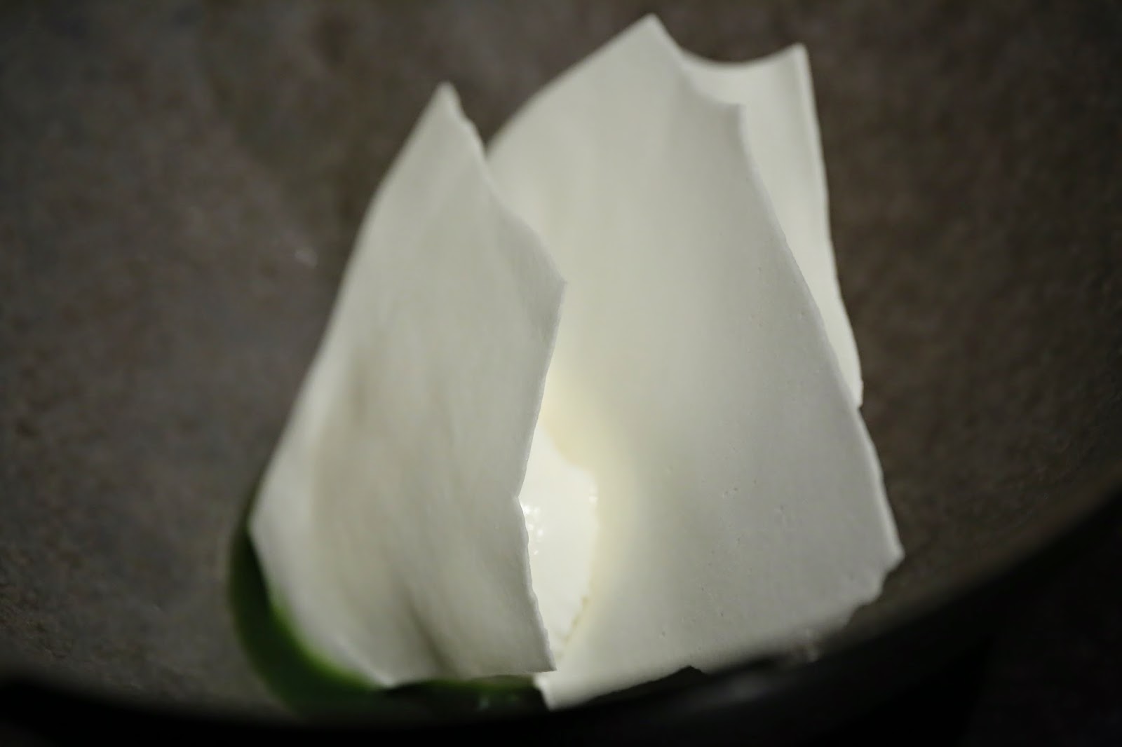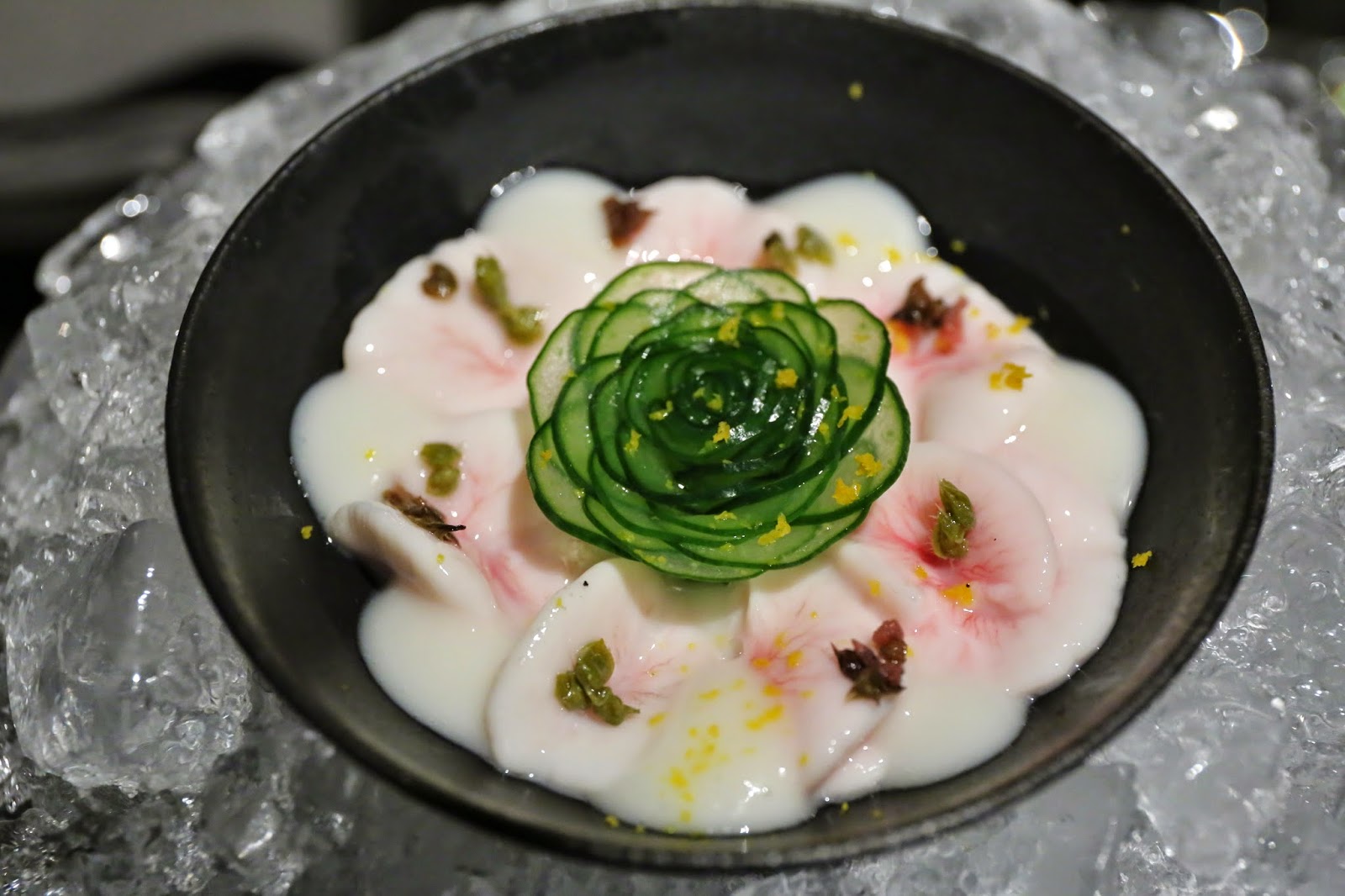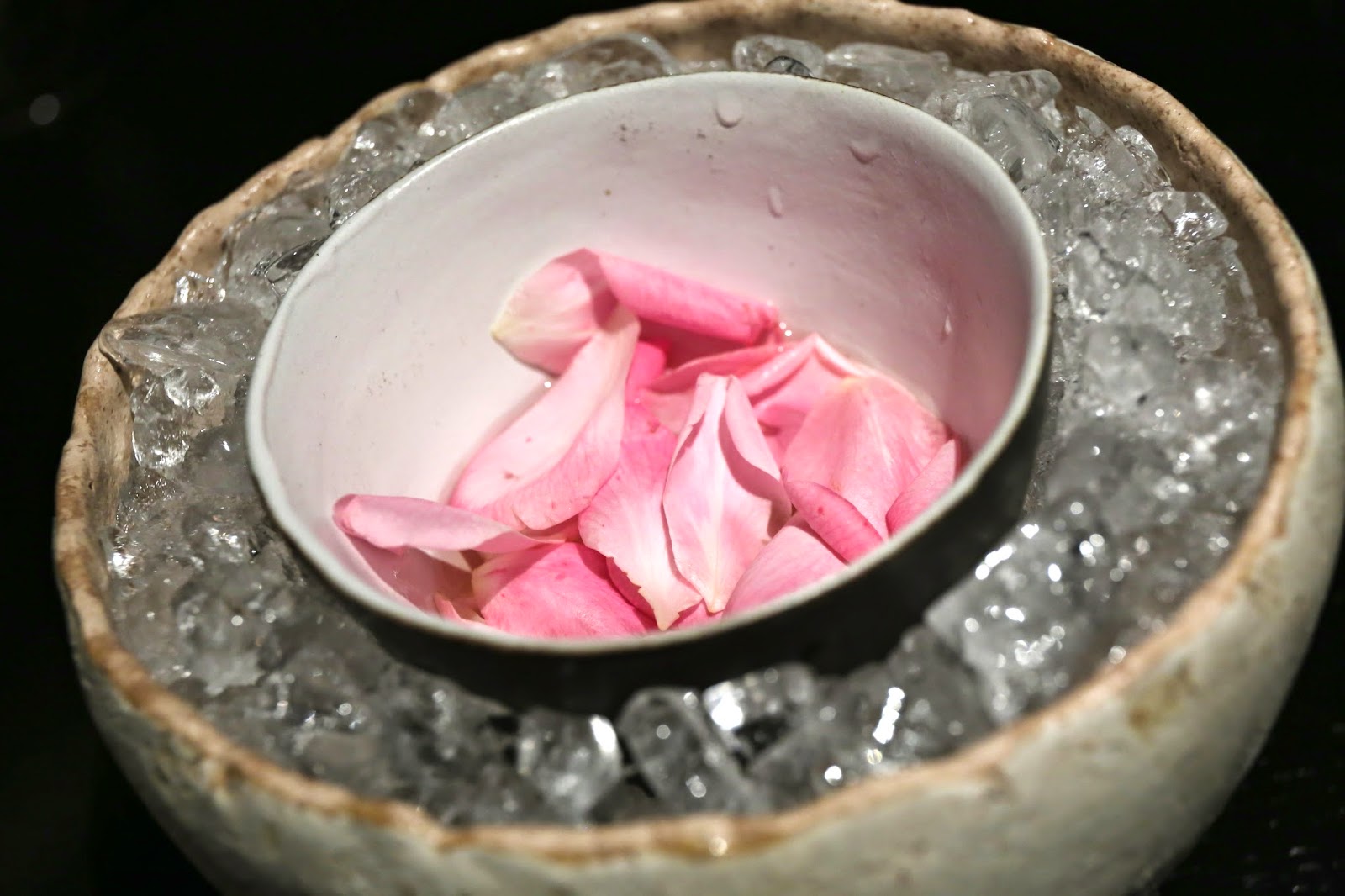 Served with a "dashi (出汁)" of rose oil and rose petals. I'm not quite getting this part... Maybe this is meant to balance out or dilute the strong, salty, umami, and slightly nutty flavors of the fermented squid, since the act of dipping the squid in the dashi meant some of the fermented sauce is washed off? The dashi itself was pretty weak, and one really needed to chew on the rose petals to get something out of them.