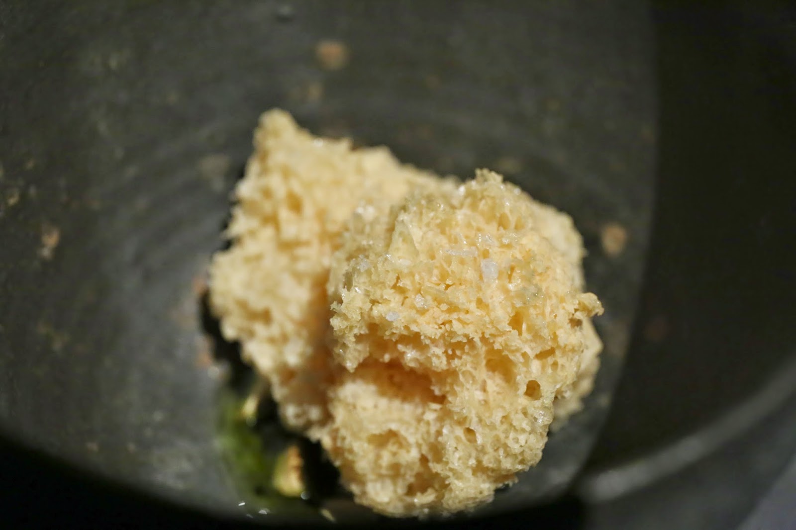 Scallop dried for two days, beech nuts and kelp - so this was scallops that had been in deep-freeze, then dried for 2 days, and blended with oil, then pumped with air to create this texture which was so much like a sponge... except that it was no longer bouncy and just sort of melted under the heat inside the mouth. Salty and definitely tasted of dried scallops, and a little nutty. Kinda interesting. Served with the same kelp sauce as the citrus dish earlier. The toasted beech nuts were very, very delish.