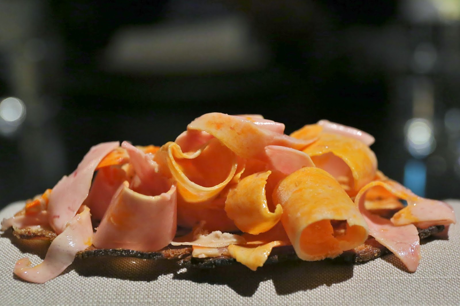 Shaved monkfish liver - O-M-F-G!!! If I were feeling nonplussed about the first 3 dishes, with this one the kitchen hit it out of the park. Frozen monkfish liver, shaved into thin strips and lightly seasoned with salt. Literally melts in your mouth. The piece of melba toast on the bottom has so much delicious butter that I wanted 3 more of these. INHALED.