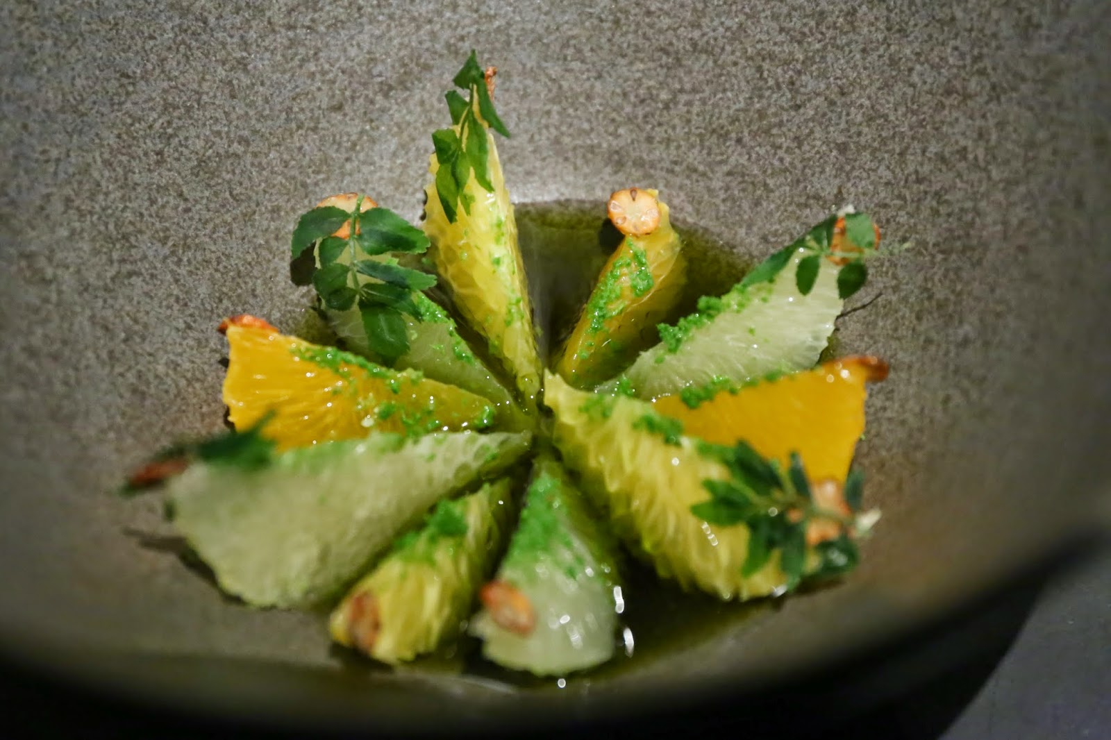 Citrus and long pepper - here we've got 4 kinds of citrus fruits - a bunpeiyu pomelo (晩白柚), Hassaku orange (八朔), buntan pomelo (文旦), and mikan (蜜柑). Served with a sauce made from Rishiri konbu (利尻昆布) and garnished with sansho leaves (木の芽) and slices of red peppercorn.