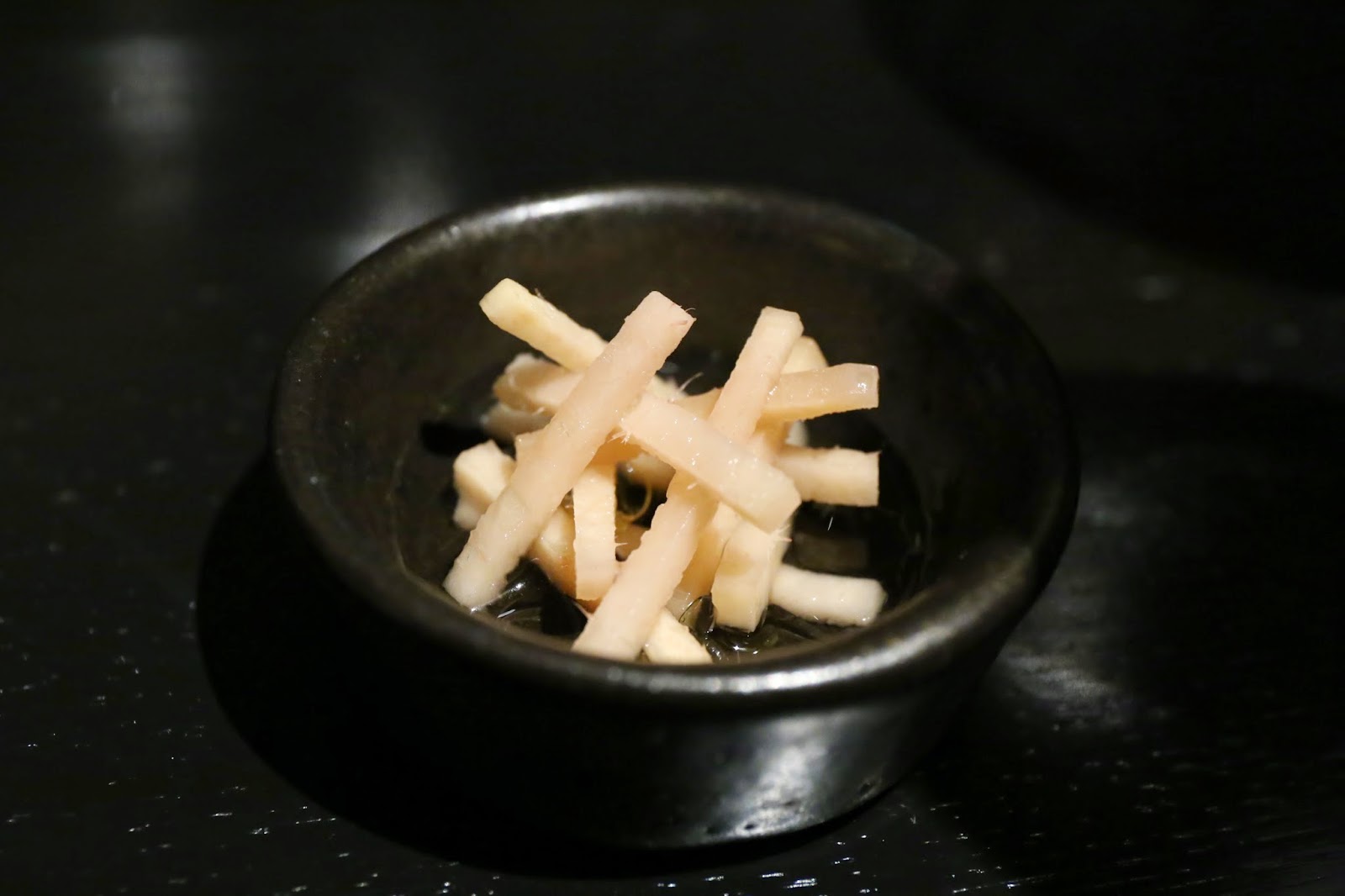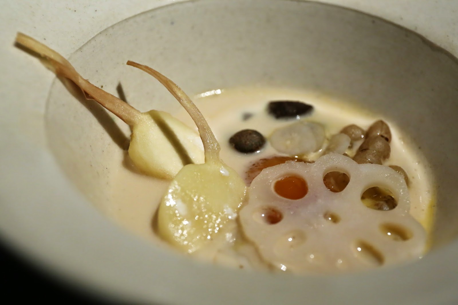 Roots and starches with ginger - oh look! A WARM DISH!!! With water chestnuts, mountain yam buds (むかご), arrowhead (慈姑), crosnes, and lotus roots surrounding an egg yolk which was cured in fermented beef juice, and peanut sauce. A nice, hearty dish with the taste of winter. Not such a fan of the yolk as I don't care for the sticky, pasty consistency, but happy to get some warmth into my stomach.