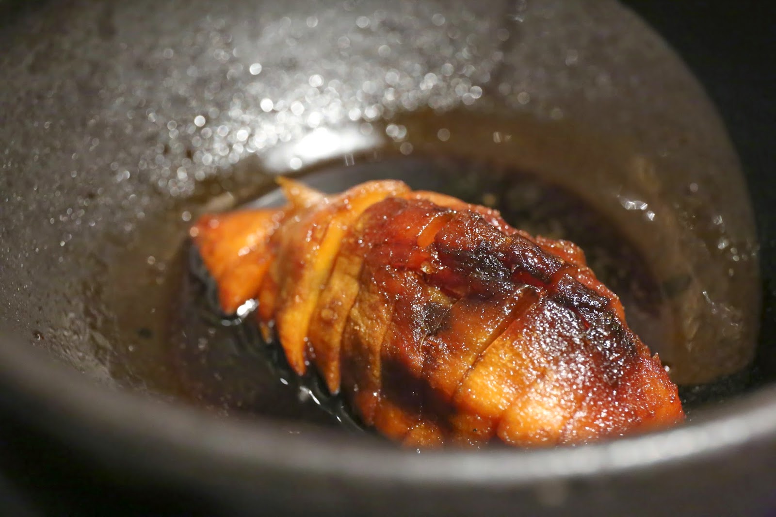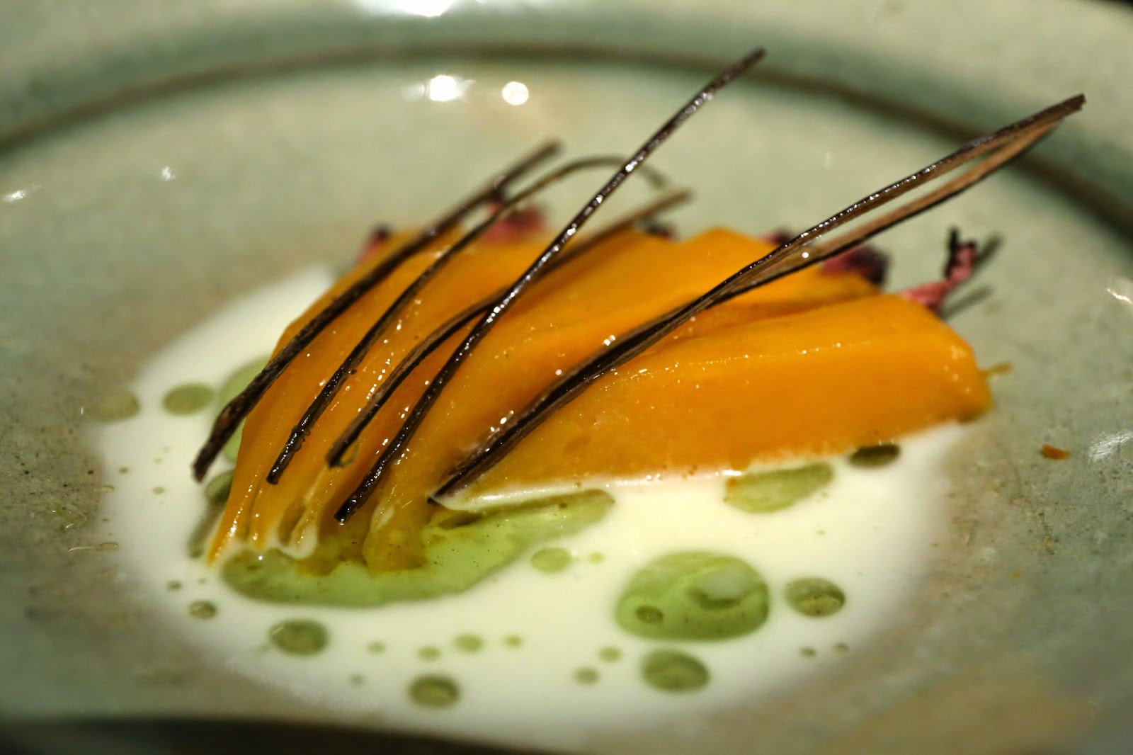 Hokkori pumpkin, cherry wood oil and salted cherry blossoms - beautiful slices of Hokkori (ほっこり) pumpkin, in a butter and fermented barley sauce. Served with salted cherry blossoms and strips of kelp. The sauce was actually acidic at the same time as being toasty and nutty.