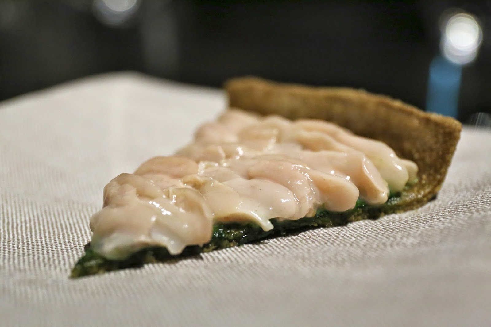 Fresh water clam and wild kiwi - another dish made famous by Instagram and social media. I had already heard about the "45 clams per tart", but the server clarified that it was 45 clams per whole tart, and we were each only getting part of the tart. The shijimi (しじみ) clams - which are just the most ordinary clams used in Japanese cuisine - were chopped up and laid on top of a layer of parsley and kiwi purée that was spread on top of a tart dough made with Rausu konbu (羅臼昆布). This was just an incredible slice of heaven, as the clean flavors of the clams worked really well with the nutty and buttery flavors from the tart dough, and the acidity from the kiwi induced a tingling sensation on the tongue. I wouldn't mind taking the WHOLE tart and having all 45 clams...
