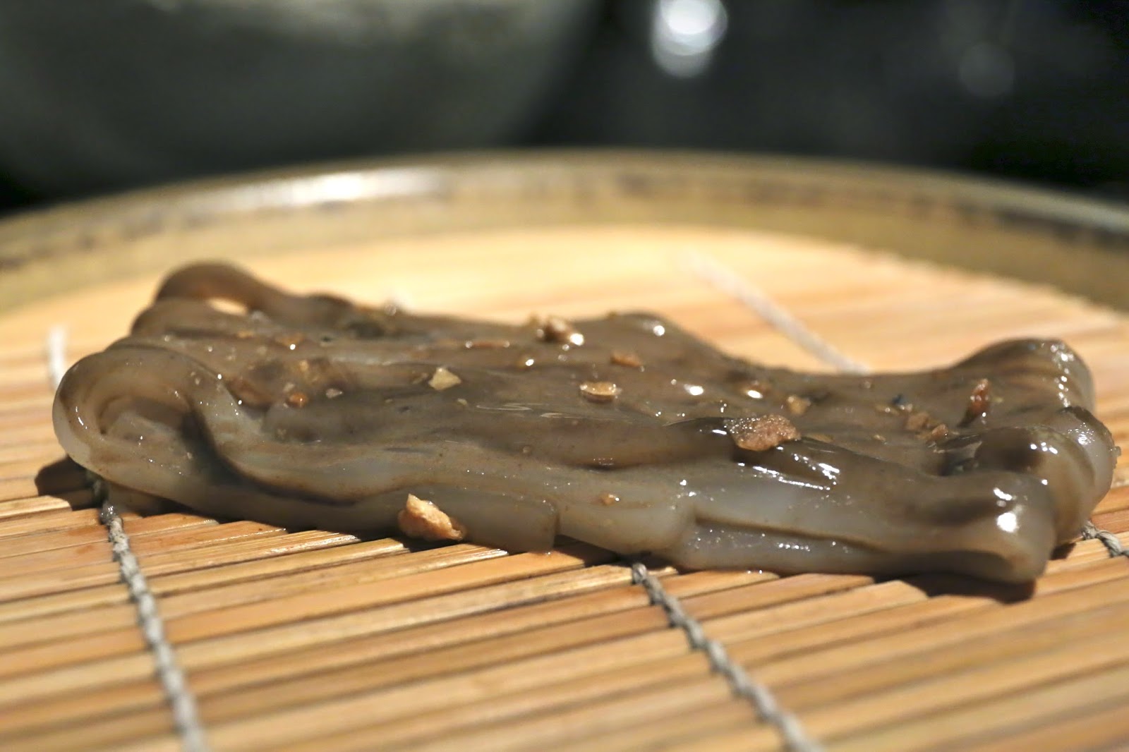 Koika cuttlefish "soba" - Noma's take on traditional Japanese shiokara (塩辛), with raw squid cut into long, thin strips of "noodles" and brushed with fermented squid.
