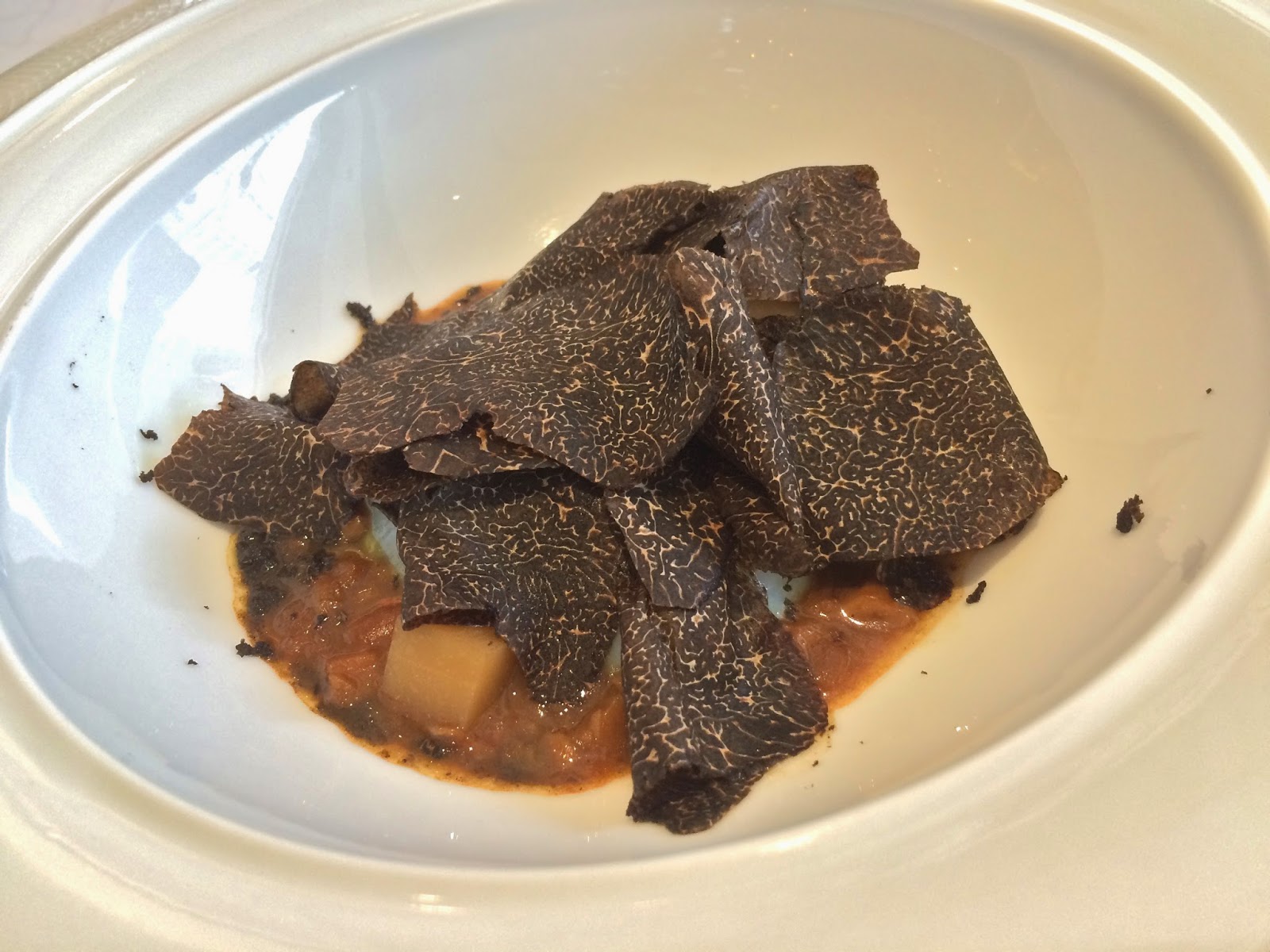 Black truffle organic egg, "melanosporum" black truffle whipped potato and topinambur - very very yum. Beneath the layer of shaved black truffle was a soft-boiled organic egg, along with a quenelle of whipped potato embedded with bits of truffle, as well as some mushrooms and cubes of pan-fried topinambour - otherwise known as sunchoke or Jerusalem artichoke. Perfect combination of hearty flavors that just naturally go together. I would have loved to have three of these...