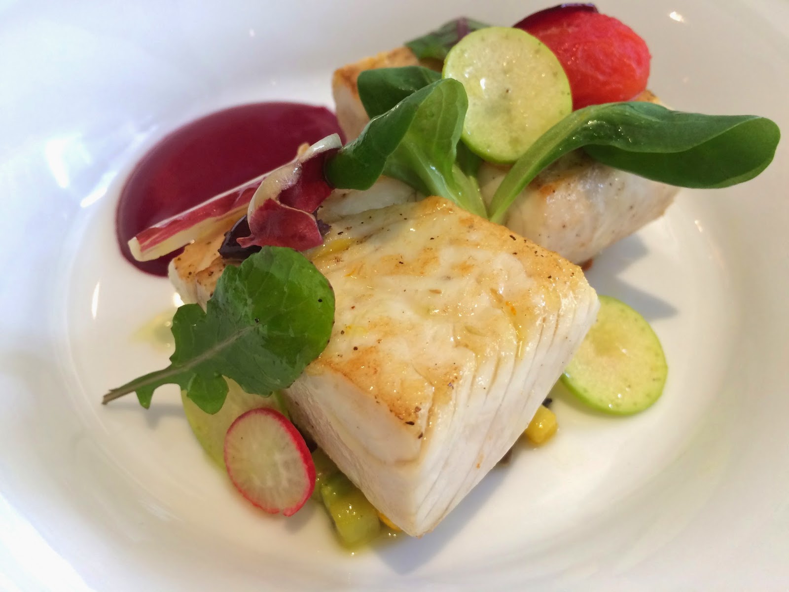 Roast amberjack, citrus and beetroot dressing, zucchini salad - I decided to pick the healthy-looking choice, somewhat intrigued by the citrus and beetroot dressing. Mrs. Tigger is suffering from dulled tastebuds today due to illness, and remarked that she couldn't taste the amberjack at all. Well, I don't think the problem lies with her tongue... since I couldn't taste much myself, either... While the cooking was well-executed, it was almost completely bland in taste. One would need to dab the fish with some of that dressing in order to get much flavor... and I have to say that the dressing itself was a little disappointing - as the citrus flavors weren't very obvious at all. The bed of zucchinibrunoise was much more interesting.