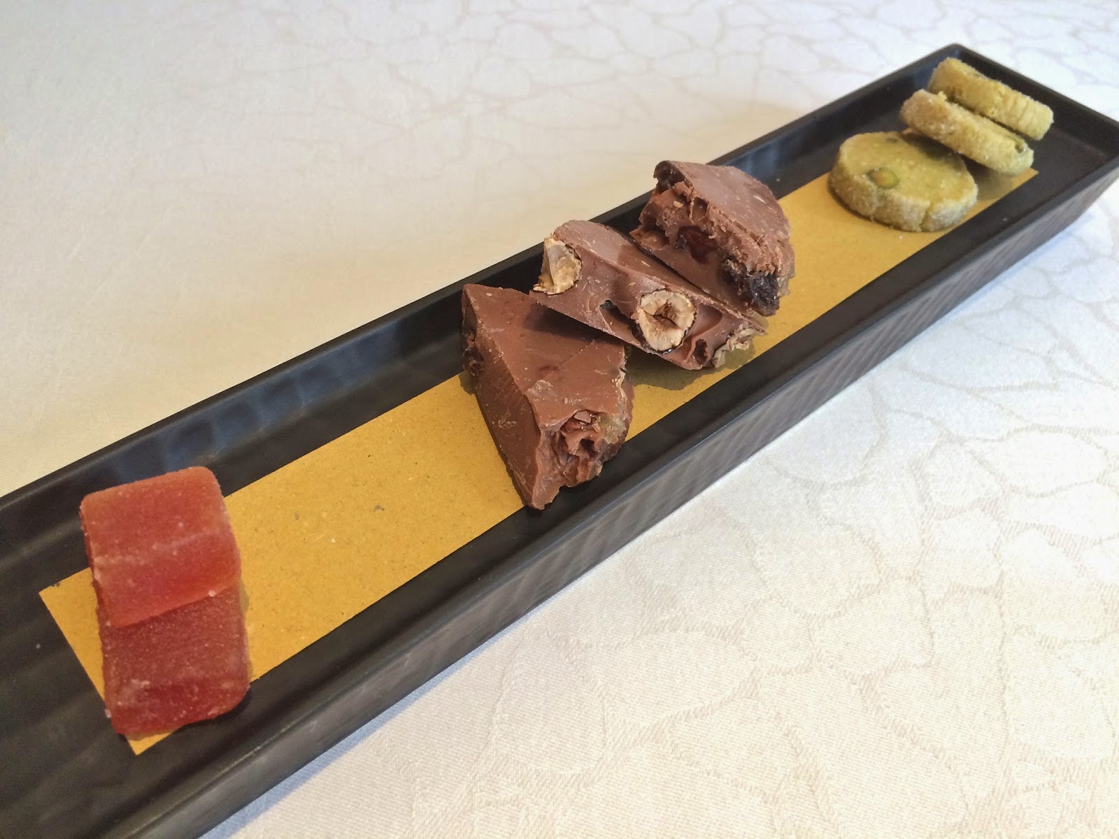 Having already exceeded my allotted quota for calories, I passed on dessert and just nibbled on the petits fours. As usual the citrus fruit jelly was good, and the hazelnut milk chocolate was a lot sweeter than expected.