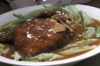 …and the solution was to order up pan-fried noodles with shredded chicken in creamy garlic sauce (蒜蓉雞絲煎生麵). We asked for the chicken in sauce to be served on the side, and took the deliciously golden crispy noodles on its own, and drizzled some of the shrimp roe sauce on top. Not the best solution, but it was the best the restaurant could offer at the time. As for the sauce? No, it wasn't meant to be like "chicken à la King", but actually pretty yummy on its own. I ate a couple of spoonfuls…