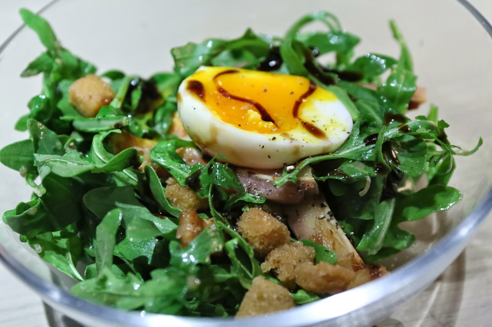 Rocket/pigsear salad - I wanted something with veg, and at the same time I could never resist the lure of pig's ears... especially when there are also croûtons and chopped bits of lardon thrown in. Love the sharp acidity here.