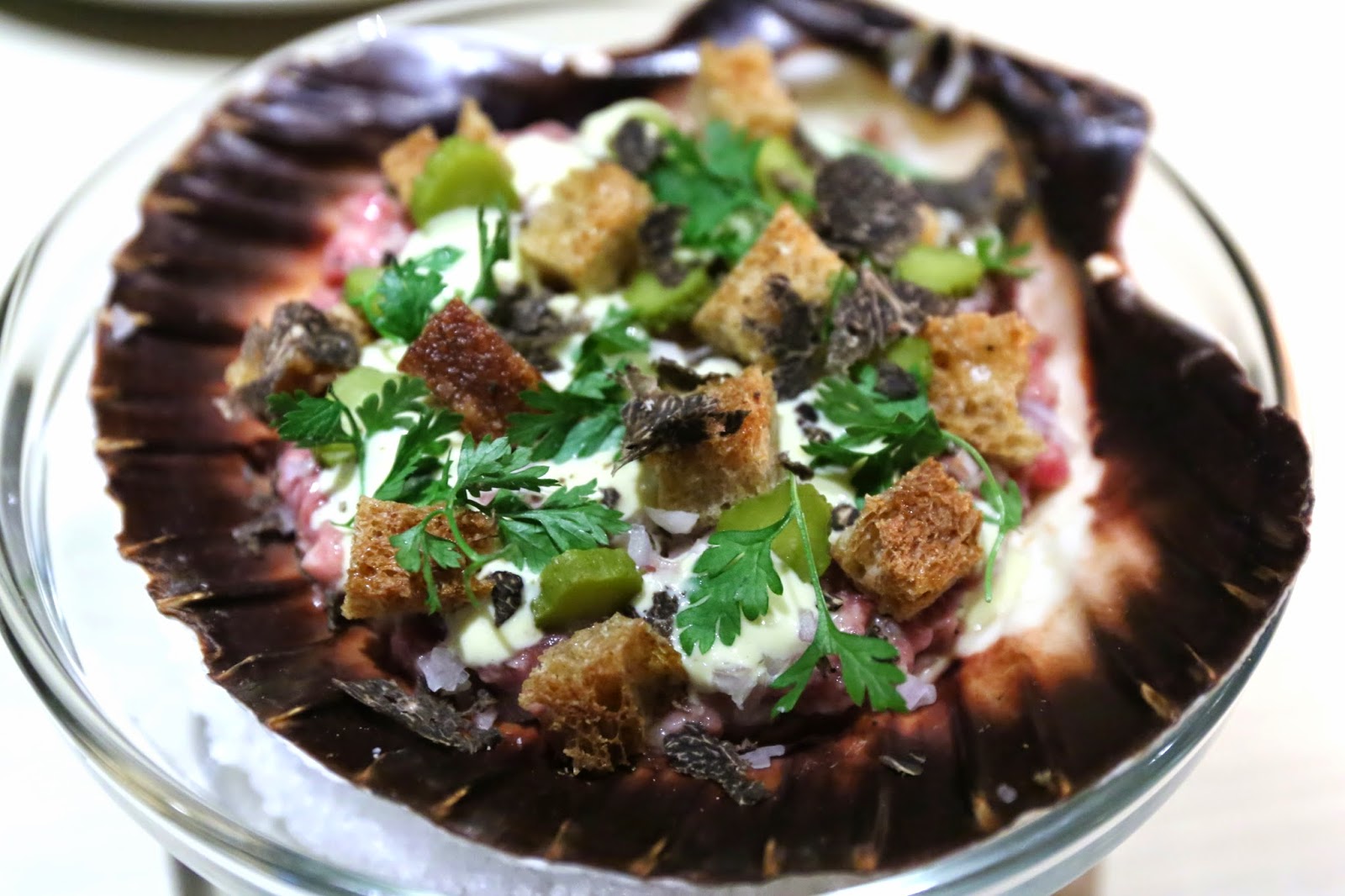 Wagyu tartare/oyster aioli - very interesting presentation... but it made sense given the oyster aioli. The texture here was much finer than the hand-beaten beef tartare that David used to serve at On Lot 10, and I really liked having the oyster flavor come into the mix... because it kinda throws you off, but in a good way. Add some chervil and black truffle shavings, and croûtons for texture, and you got yourself a pretty tasty dish.
