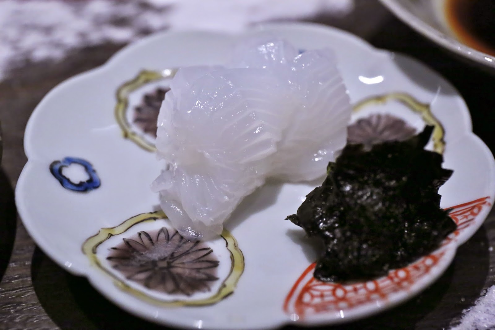 大分"アオリイカ" - scored numerous times to deliver the desired soft texture, this bigfin reef squid from Oita Prefecture (大分県) was taken not with soy sauce, but with marinated nori seaweed.