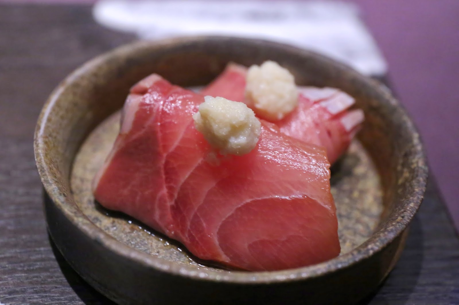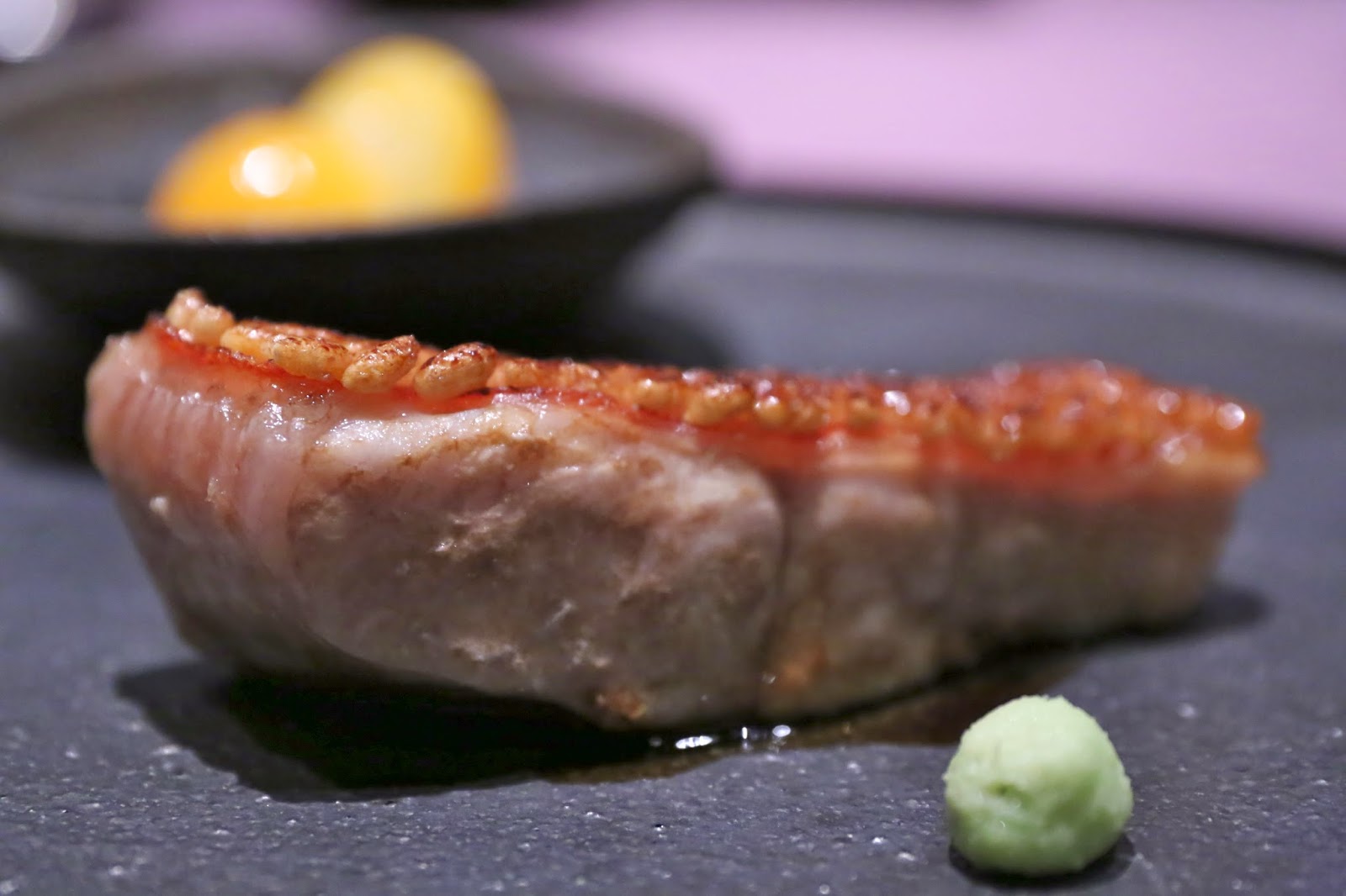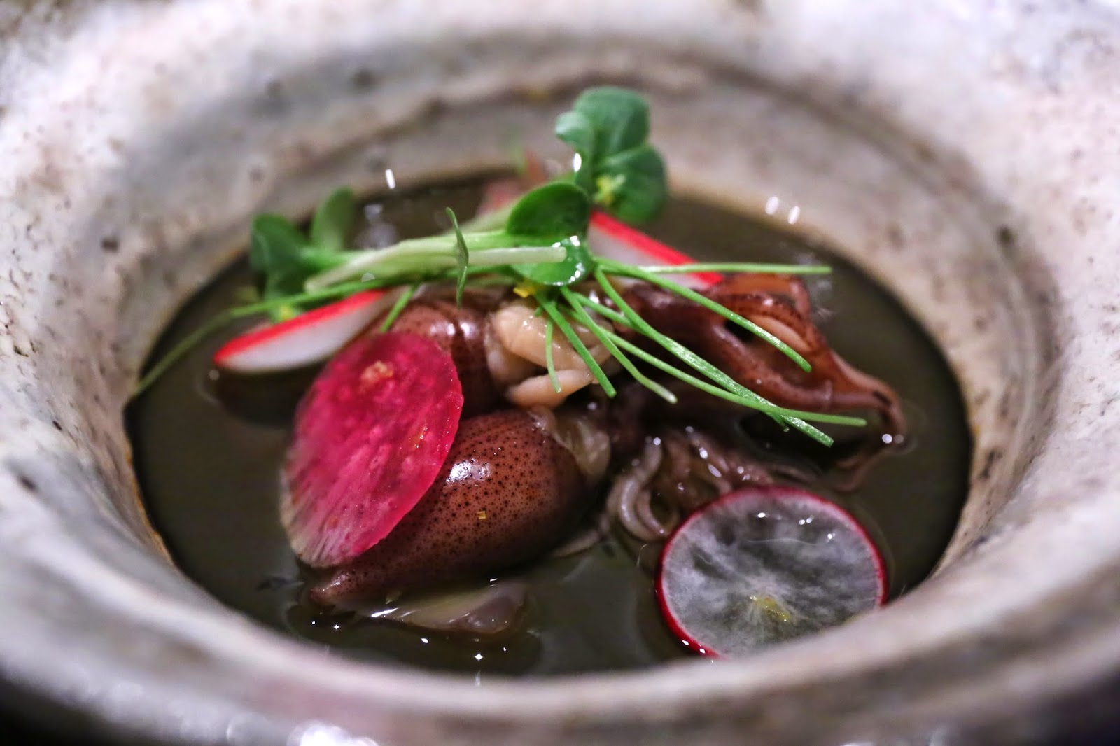 "Black custard" with hotaru baby squid (イカ墨茶碗蒸し 富山"螢烏賊"色彩大根を添えと) - one of my favorite dishes over the last few years. The squid ink adds an extra layer of flavors to the steamed egg custard, and the acidity from the ponzu (ポン酢) in the dashi just made everything so deliciously perfect... along with a hint of yuzu (柚子). The different colorful radishes on top adds a little crunchy texture. The firefly squid from Toyama Prefecture (富山県) were just absolutely incredible. I can't even begin to describe how much I loved them... just bursting with flavor, quite literally!
