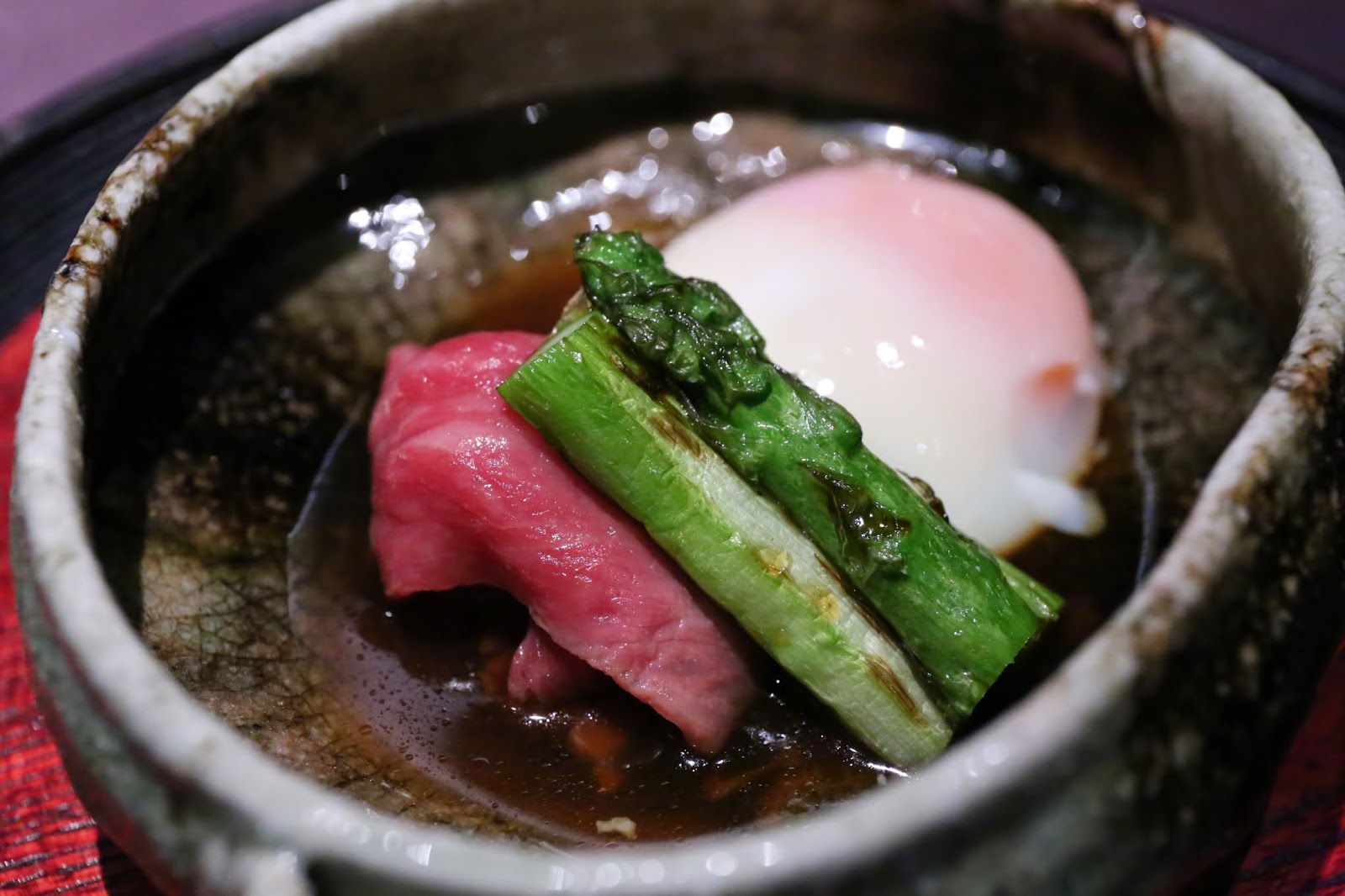 Wagyu ribeye sukiyaki with smoked green asparagus ("のざき牛"リブアイ "燻製緑アスパラ"のすき焼き 温泉卵を絡ませて) - from Nozaki Farm in Kagoshima (鹿児島), I asked for this to be prepared to the temperature that the chef prefers. This was, of course, just so silky and amazing. Nice smoky flavors in the asparagus from Tochigi Prefecture (栃木県). And that soft-boiled egg with the sukiyaki (すき焼き) sauce... I could eat another 3 bowls.