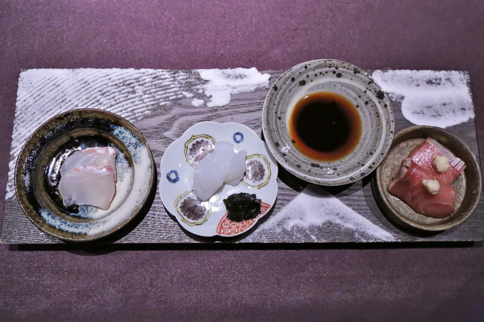 Assortment of sashimi (本日のお造り盛り合わせ) - I do love the way this is presented... with a little "painting" done with salt.