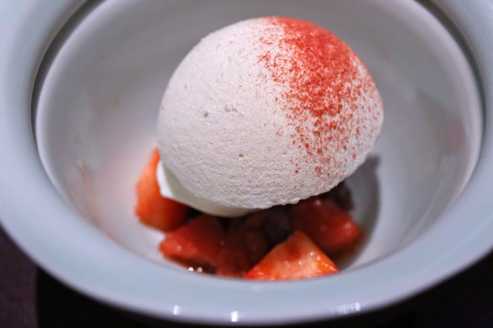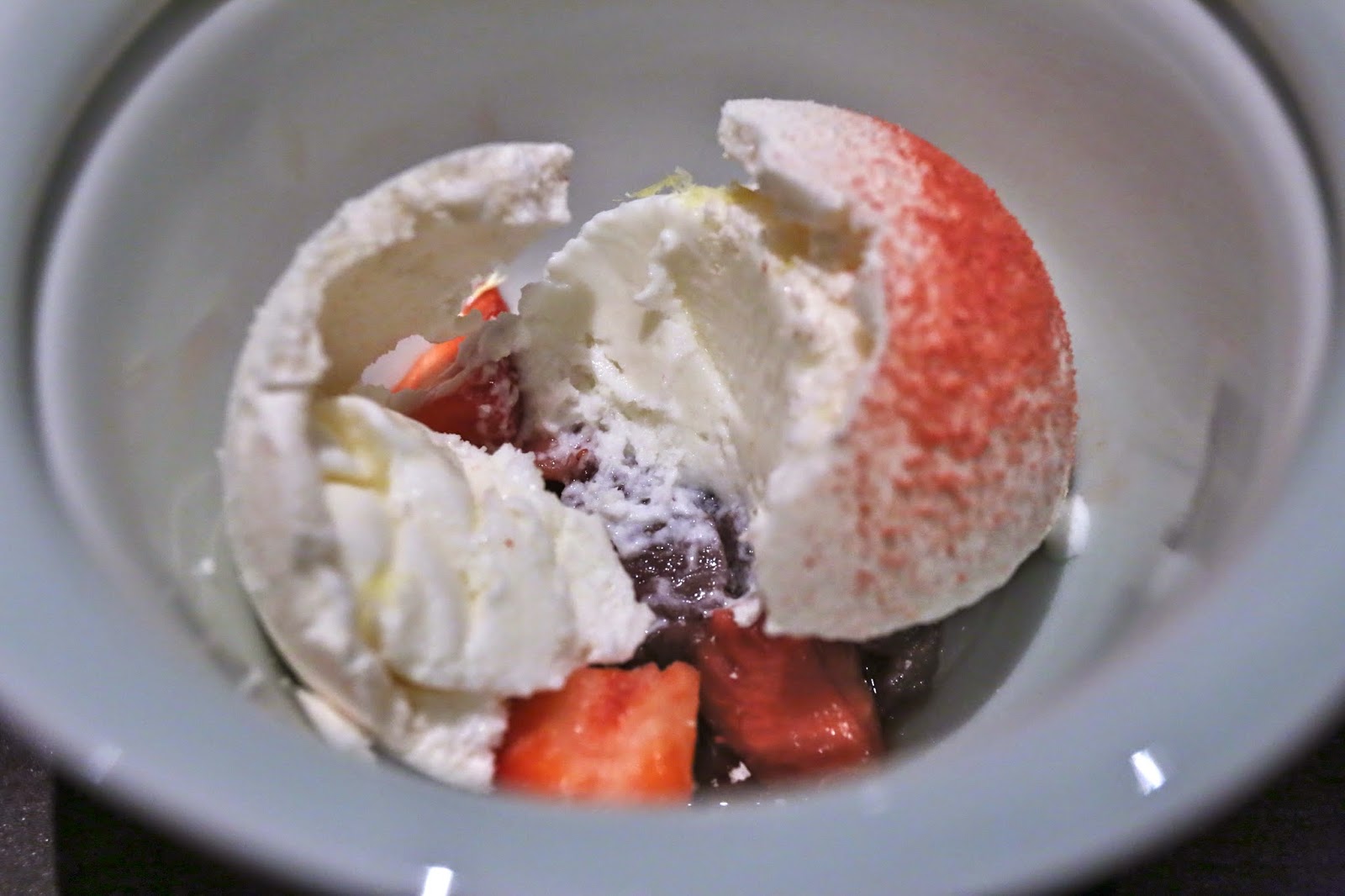 Cracking open the dome revealed the almond ice cream underneath, which was pretty nice. You get both the sweetness coming from the meringue, the ice cream, and the red beans... as well as the acidity from the strawberries.