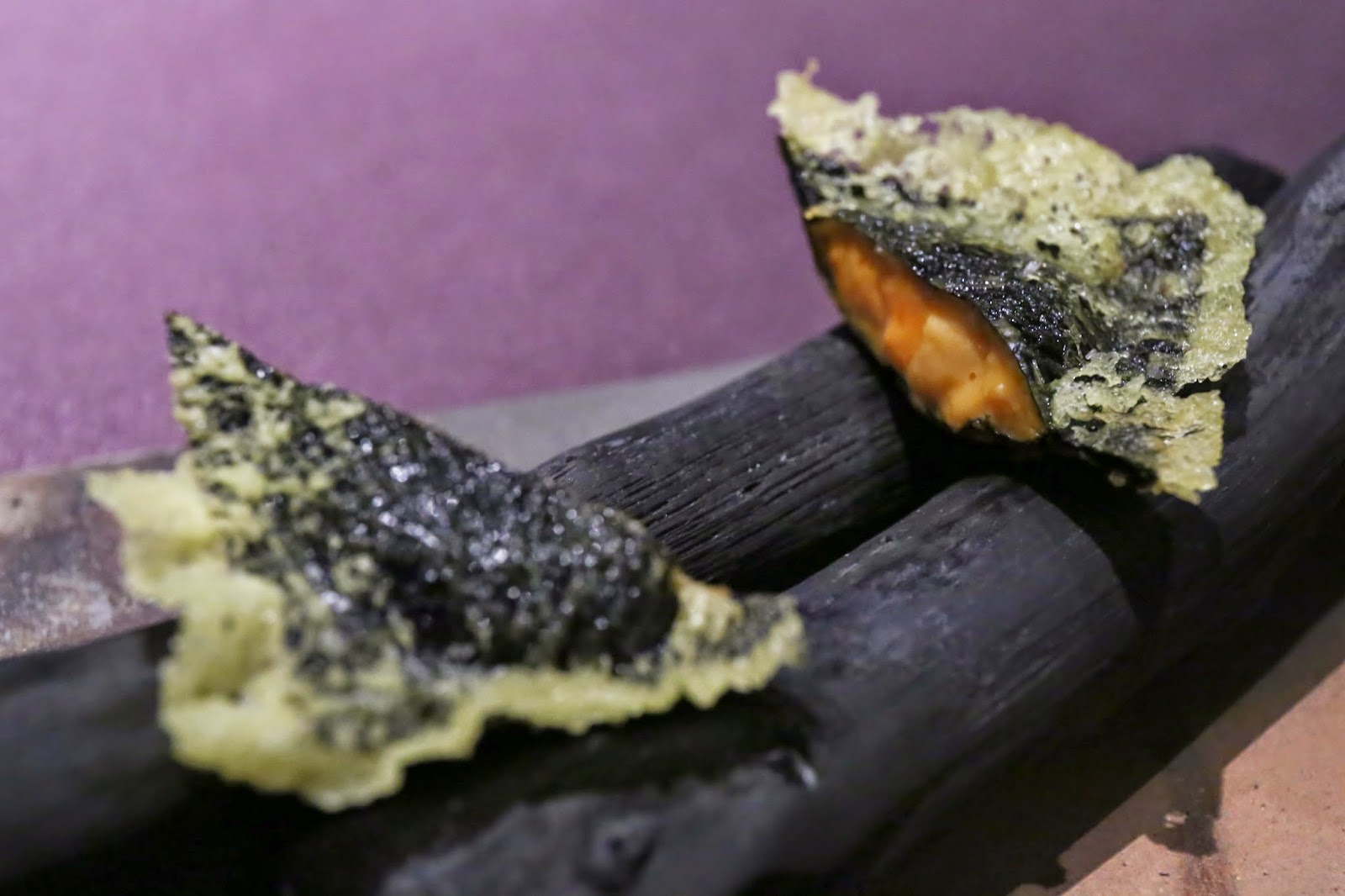 Deep fried sea urchin from Hokkaido wrapped in seaweed (レアに仕上げた浜中の "海水雲丹"サクサク磯辺揚げ) - I've had this before, and didn't really like it on previous visits. Sandwiched between nori (のり) seaweed and then wrapped in rice paper before deep-frying.