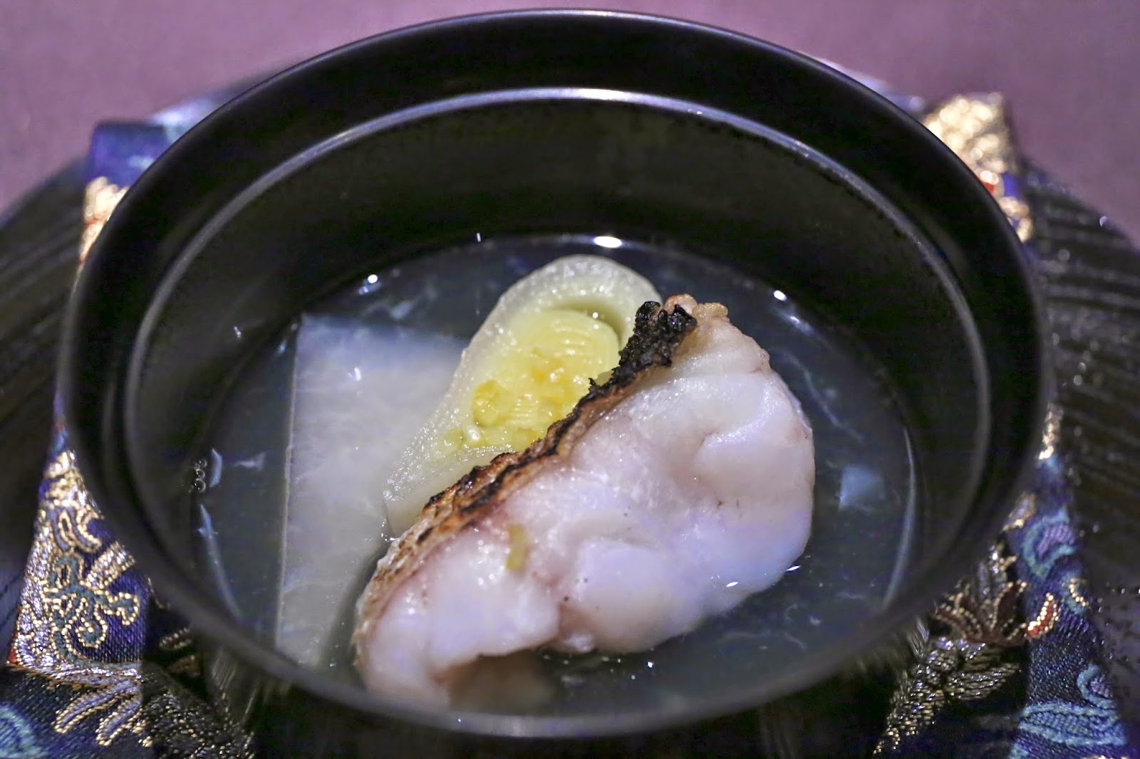 For the first time that I can recall, the soup base wasn't made of ichiban dashi (一番出汁), but made with the other parts of tilefish like the bones... etc. This gives the soup a wonderful sweetness. A little bit of kuzuko (葛粉) was used to thicken the soup slightly, and some yuzu rind was used to impart the familiar fragrance. The Shogoin (聖護院) turnip and the leek were pretty nice, too.