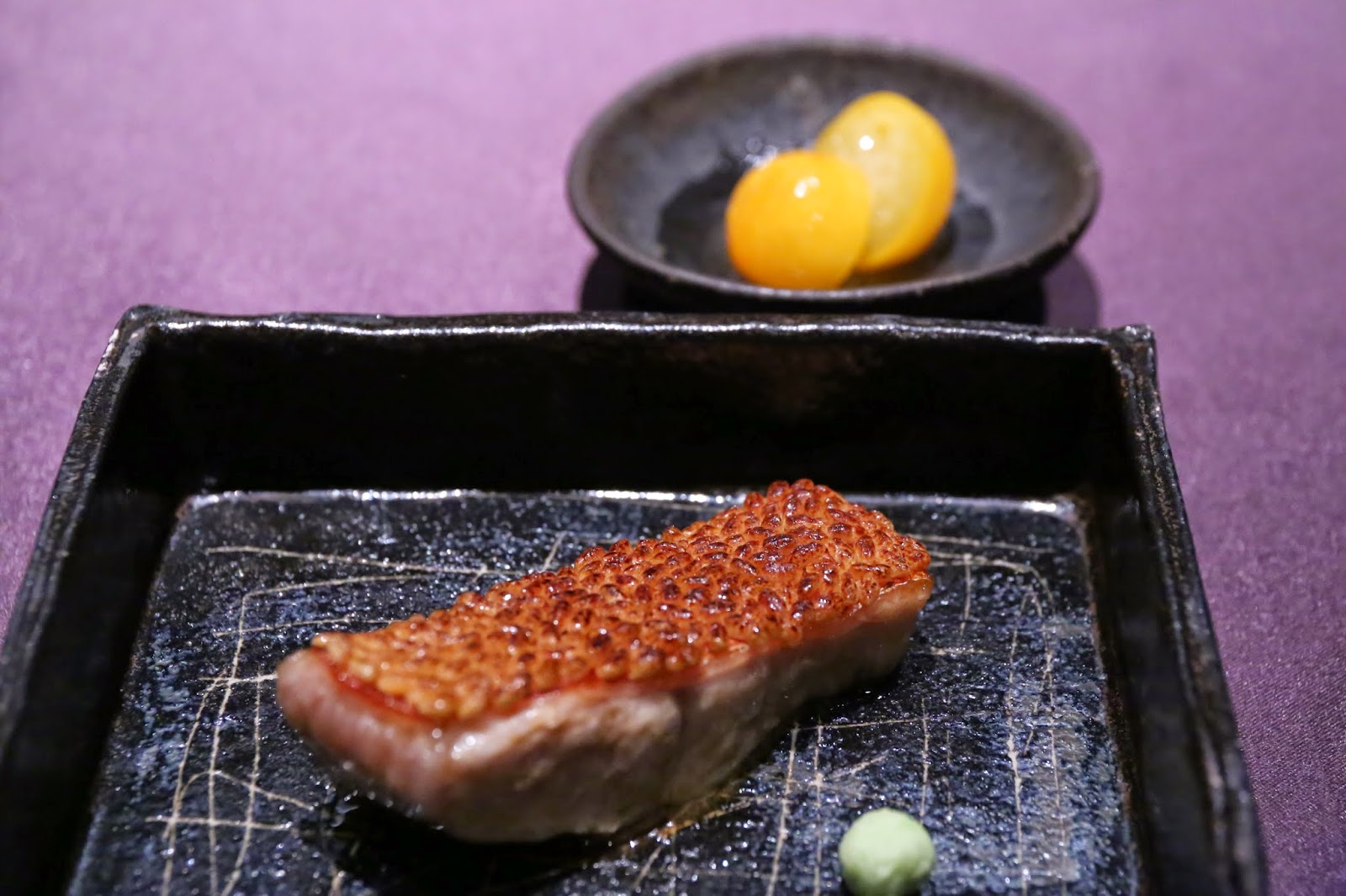Charcoal grilled alfonsino covered with roasted rice (煎り米を纏った"金目鯛"の香煎焼き 金柑のガリ) - another of my favorite dishes here, and served with marinated kumquat tonight.