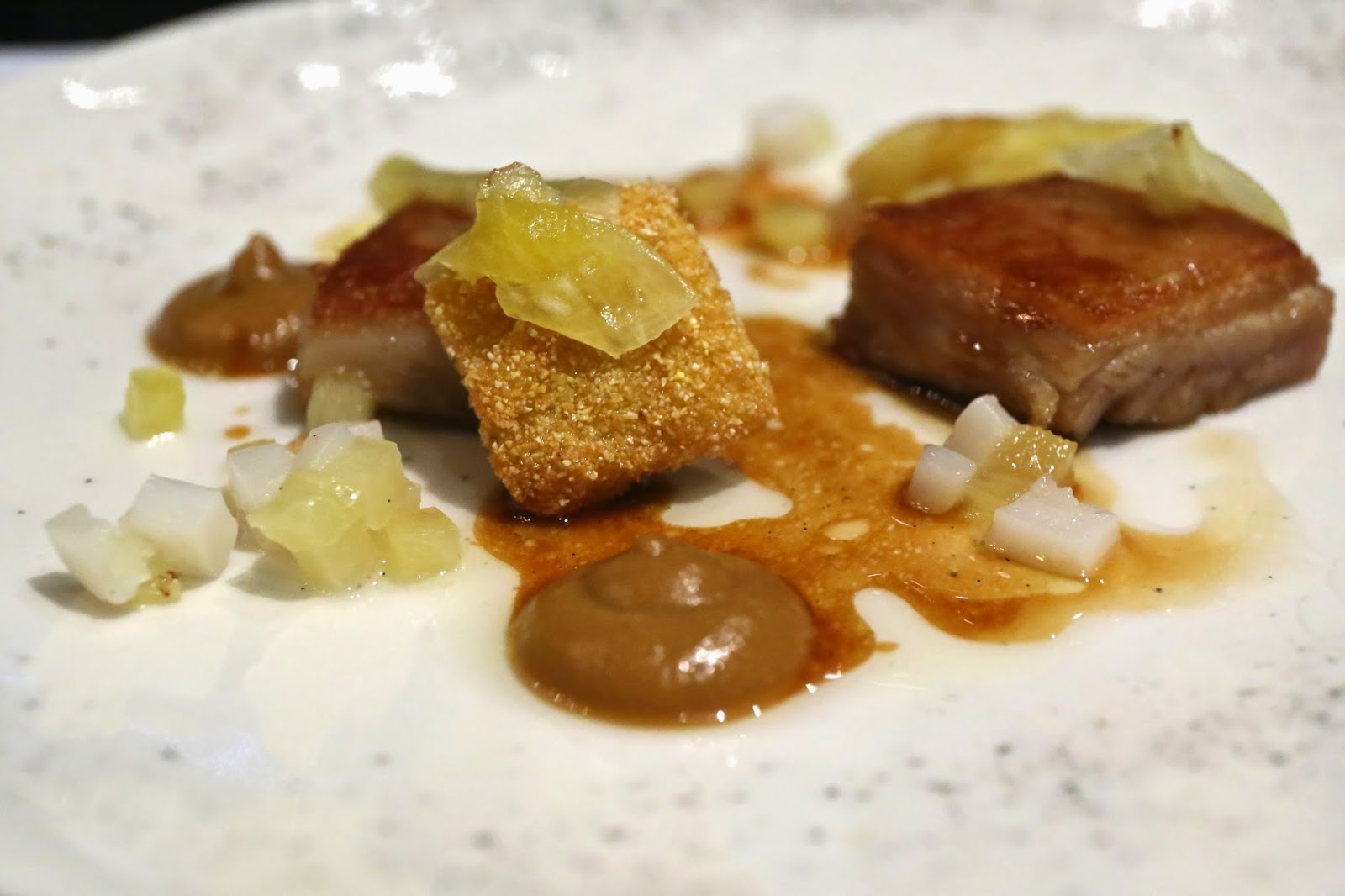 Suckling piglet belly, poached pineapple, confit squid - this was really good. I just looooved the suckling pig belly, of course... with that wonderful, porky taste. In addition to brunoise of confit squid, there were also little tablets which had been coated with bread crumbs before being deep-fried. Both were very good. And the thin slices of poached pineapple were just a really nice touch, bringing tropical fruity flavors while the acidity helped cut through the fat of the pork.