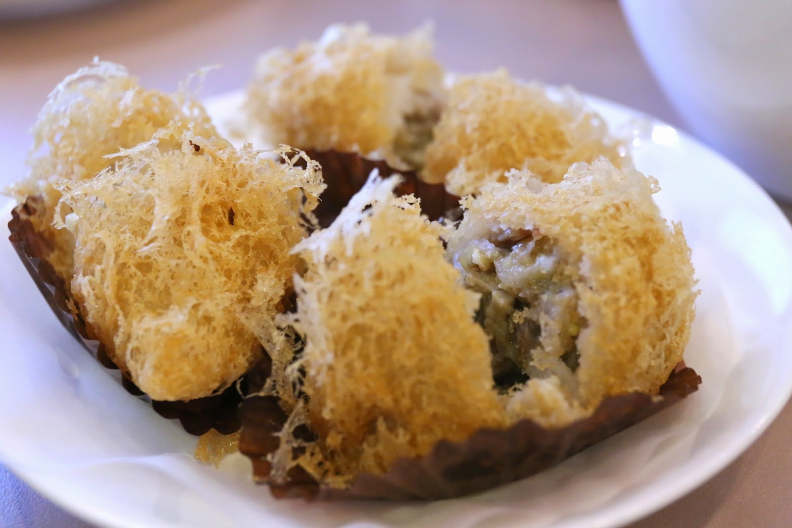We ordered a round of dim sum and quickly went back to the wines on hand. This was definitely a mistake and I should have known better. Since this place is just like Fook Lam Moon (福臨門), it means that the kitchen will just send out every single dim sum item in the space of 5 minutes... and you'll end up with 10 plates in front of you that you can't finish without things getting cold. I had long ago learned to order dim sum in multiple rounds at Fook Lam Moon, but I was totally distracted today... So we had to send a couple of items back while I grumbled about this service issue.