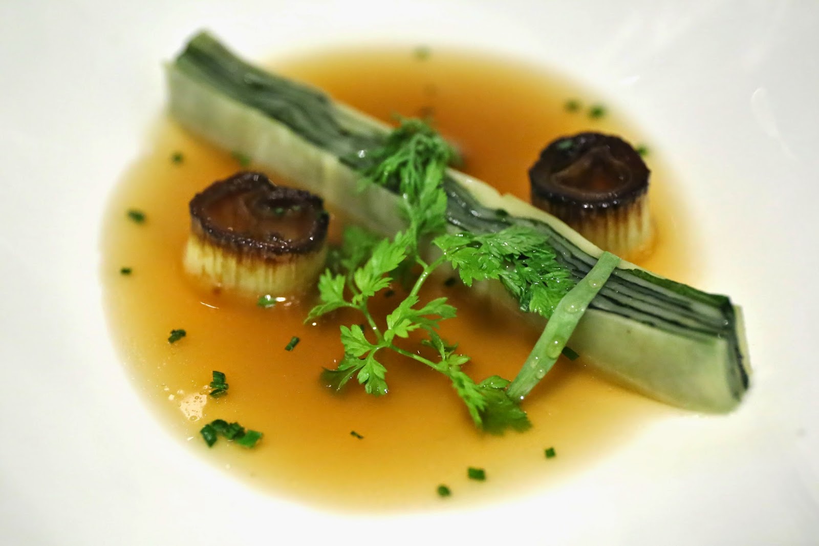 Comté and spinach, with leeks and onion consommé - now THIS was interesting! A millefeuille made with layers of Comté and spinach! Very, very nice. Loved the charred leeks and the consommé. Nice touch with the chervil.