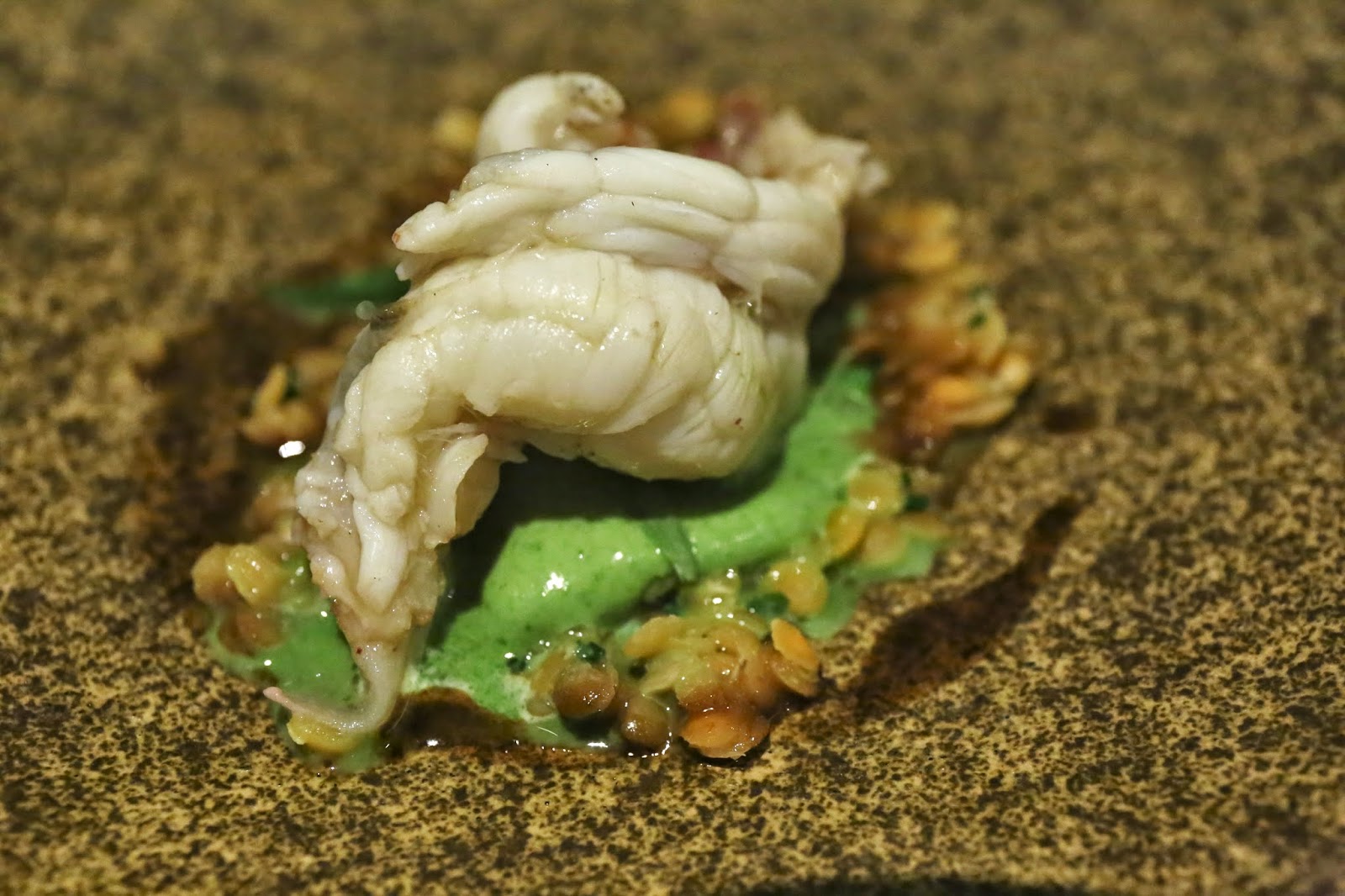 Lobster cooked in lobster consommé, with lentils and tarragon chantilly - one of Akrame's signature dishes seems to be the way he finishes cooking his lobster in a container by immersing it in hot lobster consommé. This was nice. But we all complained to the chef about not being able to drink that consommé...