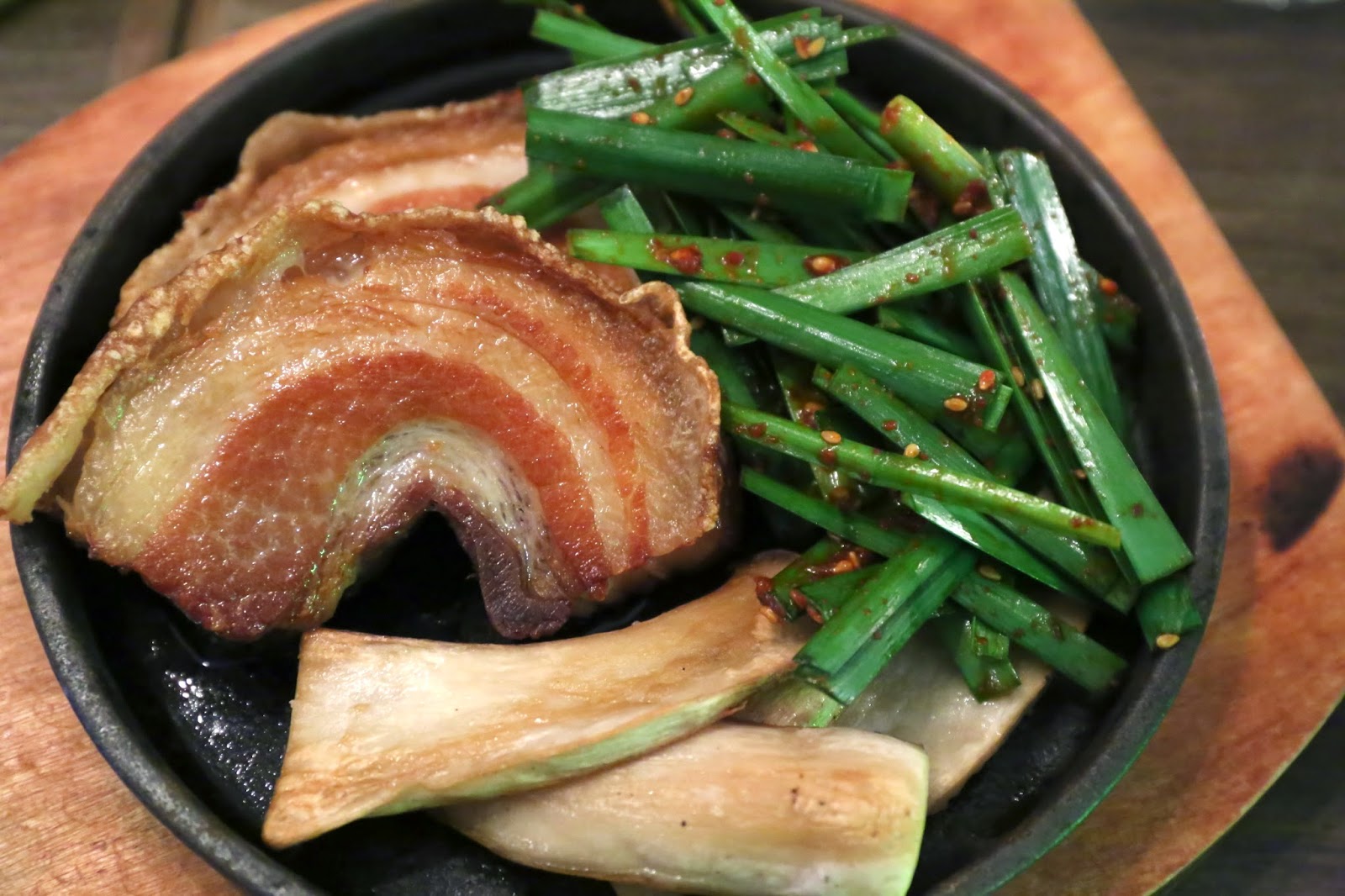 Korean porchetta - the minute I saw the word "porchetta", I knew we had to order this. This, in effect, is an updated version of bossam (보쌈) - where the soft, boiled pork belly is replaced by the crispy Italian variant made with Berkshire pork. Gotta say that this was really, really yummy... but then again, why wouldn't it be?! Take some red leaf lettuce, add a piece of porchetta, some chives, a slice of eringi mushroom, and spread some sauce on top before closing the wrap. Yum.