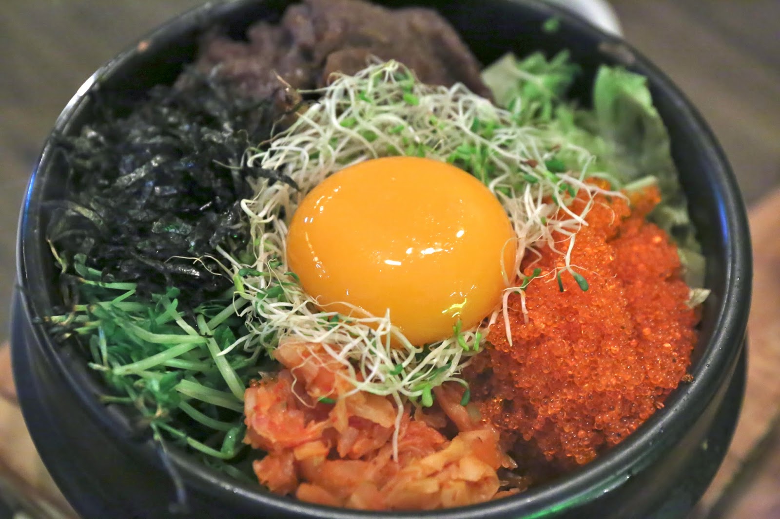 Stone pot rice with fish roe and beef - I misread the menu and didn't realize that when you ask for beef, the rice comes with both fish roe and beef... which isn't necessarily a bad thing. I was tasked with mixing all the ingredients together - something I accomplished clumsily. I gotta say that the flavors were pretty good, especially with the addition of flying fish roe. The alfalfa sprouts and baby pea shoots added a nice, green side to the flavor profile.