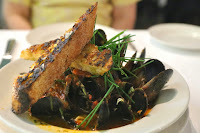 Steamed mussels with tomato, chilies and herbs - normally it's not my thing, but I was sharing this with L. Pretty good, actually... and only 1 or two of them had a tiny grain of sand. Nice kick from the chili, and plenty of herbs.