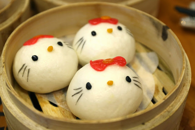 Hello Kitty custard buns with egg yolk (流沙包) - aren't these cute?! According to this CNN article, Hello Kitty's red bow is dyed with beetroot, nose is dyed with carrots, and eyes/whiskers black with squid ink.