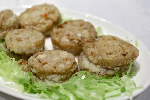 Pan-fried lotus root cake with shrimp paste (椒鹽百花蓮藕夾) - a classic. The two slices of lotus root are held together by a layer of minced prawn (蝦膠). Loved the crunchiness of the lotus root, and the springy texture of the minced prawn. I was a little overwhelmed by the layer of salt coating at first, but gradually got used to it.