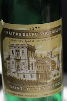 1973 Ducru-Beaucaillou - opened and decanted 10 minutes before serving. Funky nose with pine forest. A little chalky? A little stinky, with animal notes. Lighter than the '61. 91 points.
