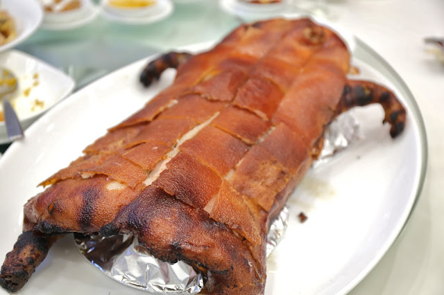 Roasted suckling pig (天下第一豬) - ah yes, the "number one pig under the skies"... or so the restaurant claims. We would naturally compare this to the one at Fook Lam Moon (福臨門) / Guo Fu Lou (國福樓) / Seventh Son (家全七福), which is kind of the standard-bearer in our minds. I'm not sure that this was significantly better or worse than what I could get at the trio of restaurants above, although I think if I had to pick fault, the crackling tonight was a little bit uneven. But heck, this was a roast little piggy! Ain't nothing better than this in the world!