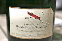 Mumm Blanc de Blancs Mumm de Cramant - very nice mousse, pretty light, elegant, and rounded on the palate. A little toasty. Also a little ripe on the palate but not too much. "Small" production of around 4 to 5,000 cases annually. This wine was originally a private cuvée of the house and not released for sale. The distinctive label harks back to the days when the bottles were only given to friends, along with a business card folded at one corner - to indicate that the wine was delivered in person.