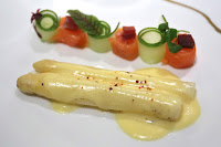 L'asperge: classic steamed white asparagus with Hollandaise sauce - it's still asparagus season, so it's not surprising that this came up on the menu. This, of course, works wonderfully well with Champagne. We also have cured salmon with chunks of ham, as well as cucumber ribbons.