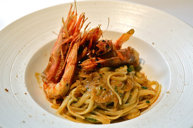 Linguine, Spanish red prawns, shrimp paste, garlic, chili and bottarga - I can never resist any carabineros, and although these were significantly smaller than what I used to have, I got to have 4 of these... and that means 4 heads I can suck the goodies out of! That shellfish sauce with dried shrimp... so much umami. A little bit of chili to add some kick, and shavings of bottarga on top.