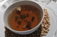Mushroom: organic, custard, pearl barley, chicken, consommé - this is something I had for lunch last month, and it was just as delicious tonight. I mentioned that previously I was told not to eat the barley on the plate, and a discussion about "recycling" food ensued... Well tonight I nibbled on a couple of grains just for the heck of it.