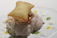 Salmon and caviar: organic, Scottish, home smoked, cedar wood, king crab, bagel, egg - this dish had multiple components... First there was the salmon which, I am guessing, may have been cured or cooked sous vide just for a few minutes. It was then smoked for about 10 minutes inside a glass dome, with chunks of really smoky cedar. It was then plated with sour cream, egg white and egg yolk "dots"... and we were meant to smear the dots on the salmon before tasting. The salmon was very tender and yielded to the knife easily, and the smoky flavors filled the air around the table. Very tasty.