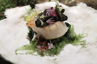 Scallop: French, diver caught, stones, lemon, sea grass, dashi - actually I think these were Japanese scallops, and they were HUGE! This was another lovely presentation. The staff poured what may have been seawater (from the Fragrant Harbor perhaps?) onto the bed of grass, reacting with the dry ice below to create a layer of "fog" which is meant to smell like the ocean. Yes, very "fragrant" indeed...